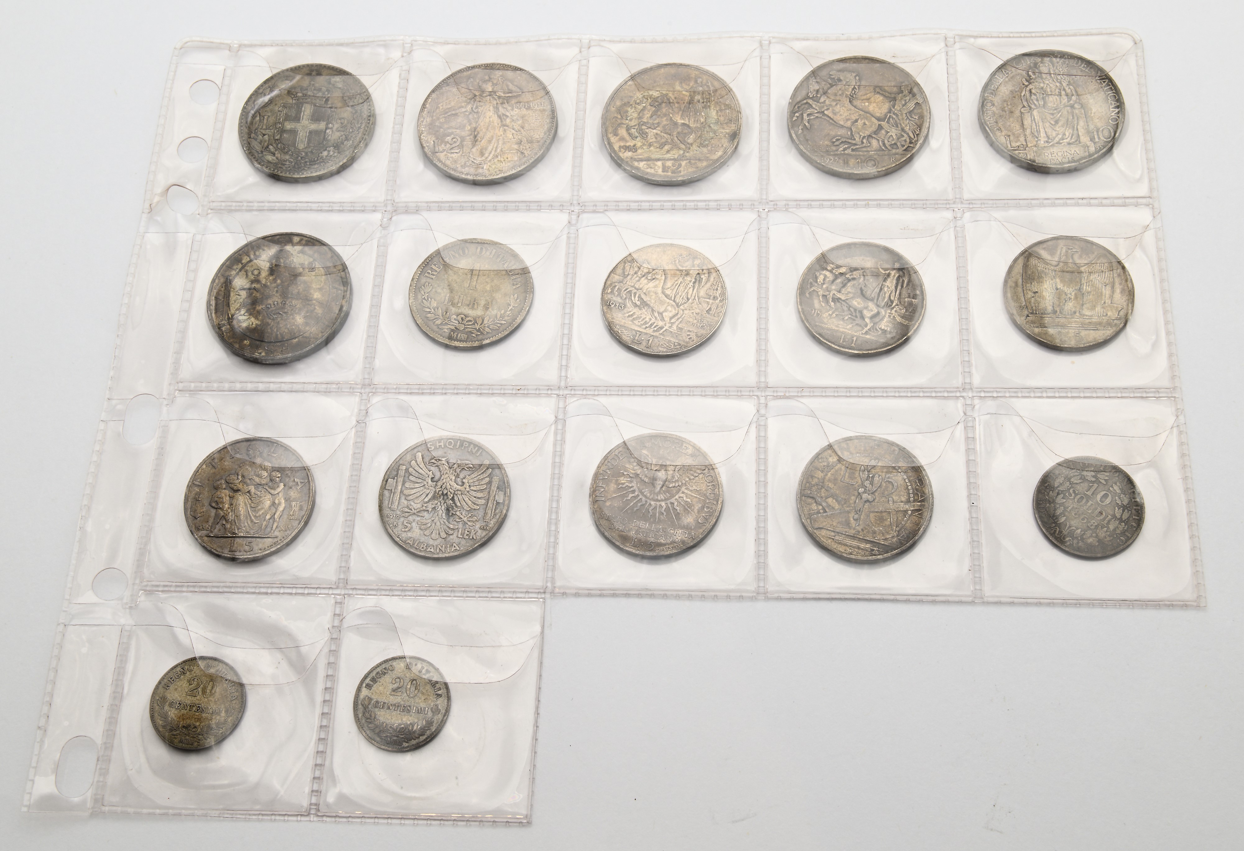 Lotto monete: Regno d'Italia 1 Lira Valore 1863M, 2 pezzi da 20 Cts Valore 1863M Vittorio Emanuele II, 2 Lire 1883 Umberto I; 2 Lire 1911 e 1916, 1 Lira 1913 e 1915, 10 Lire 1927, 5 Lire 1927 e 1936, 5 Lek 1939 Vittorio Emanuele III; San Marino 10 Lire 1932, 5 Lire 1931; Città del Vaticano 10 Lire 1935 Pio XI, 5 Lire Sede Vacante 1939; Stato Pontificio 10 Soldi 1868 XXIII