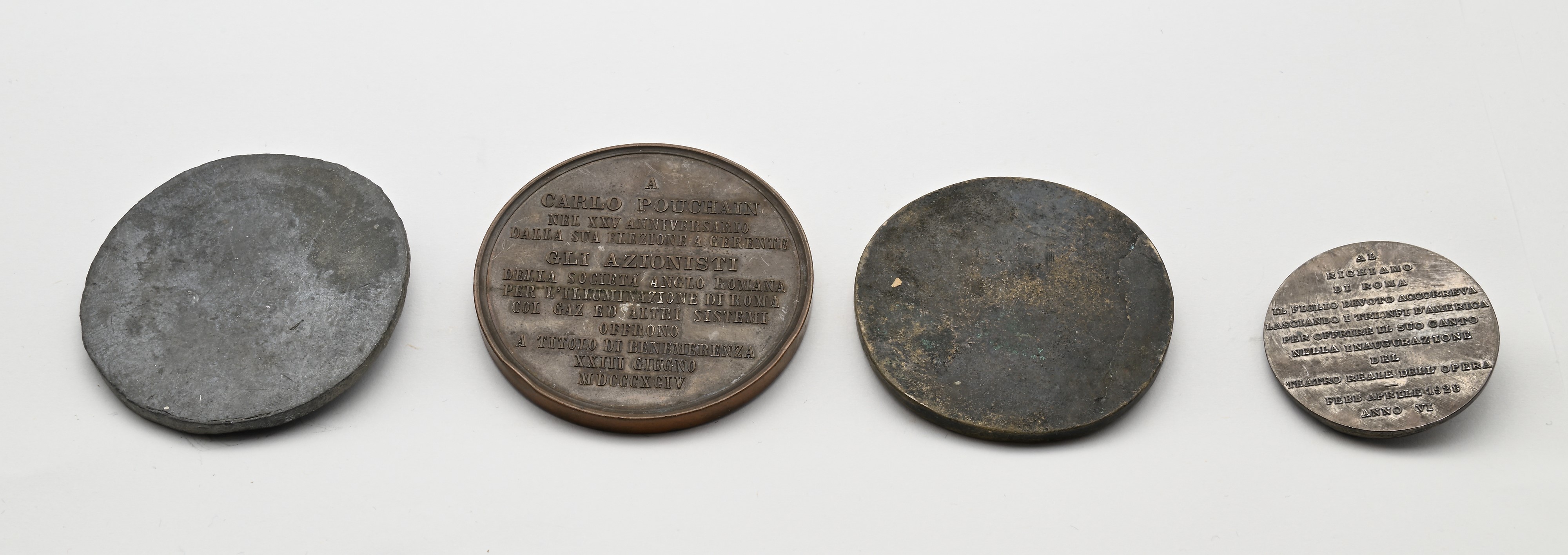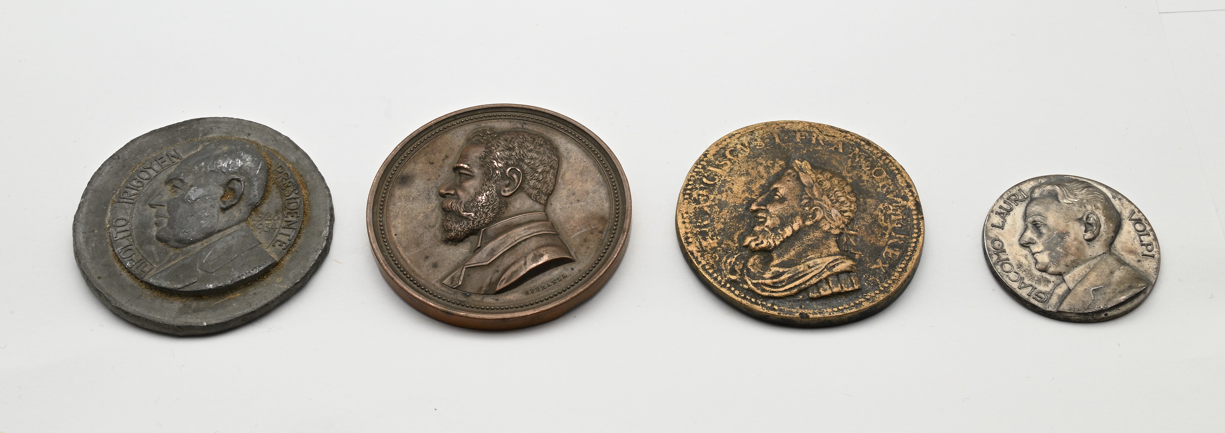 Medaglia in bronzo opus Filippo Speranza Benemerenza Carlo Pouchain 1894; medaglia in bronzo uniface Franciscus I Francorum Rex; medaglia in metallo argentato 1928 Giacomo Lauri Volpi in occasione dell'Inaugurazione del Teatro dell'Opera di Roma; medaglia di zinco raffigurante il presidente argentino Hipolito Irigoyen