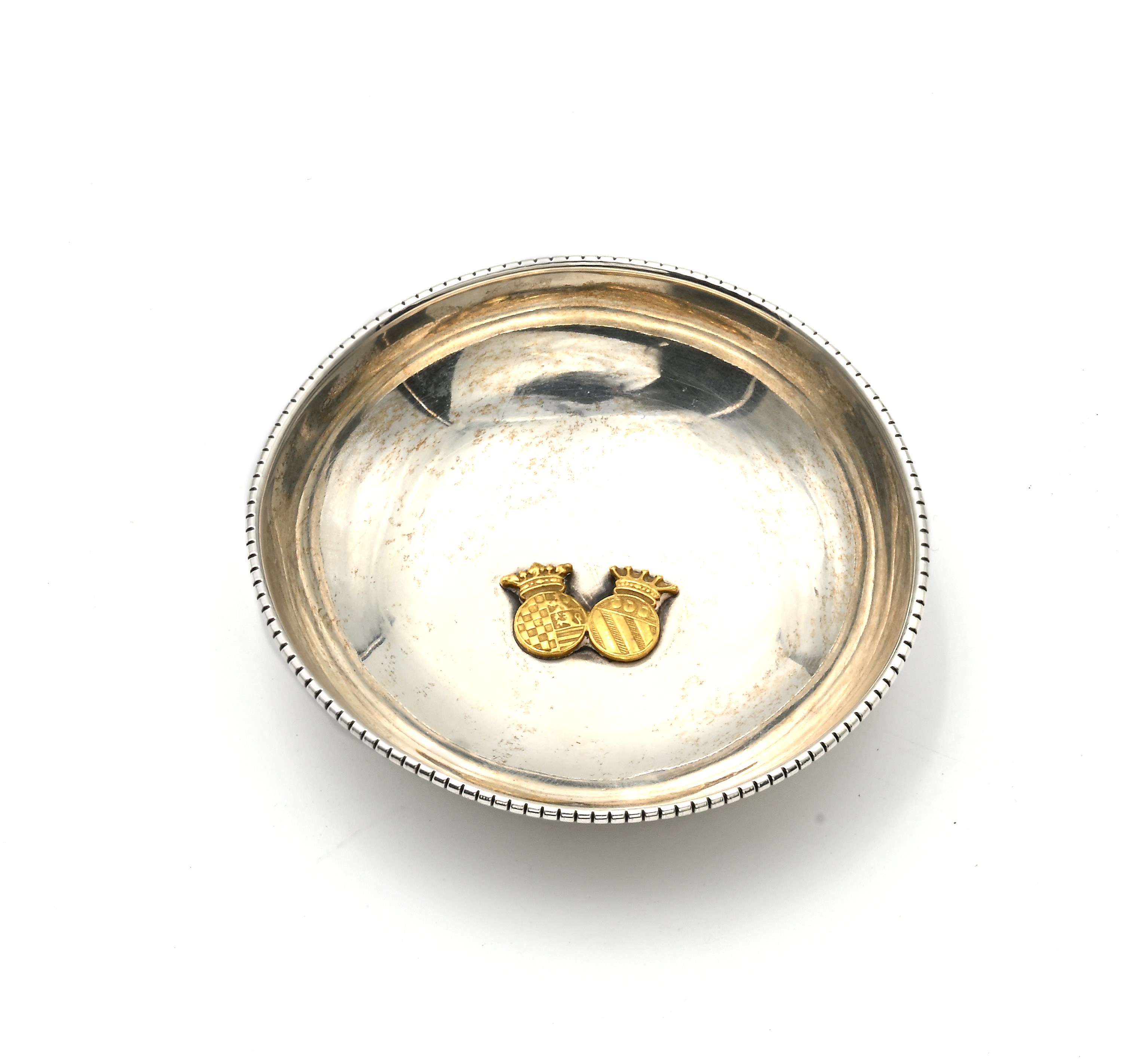 Piattino in argento con al centro 2 stemmi nobiliari applicati in metallo dorato