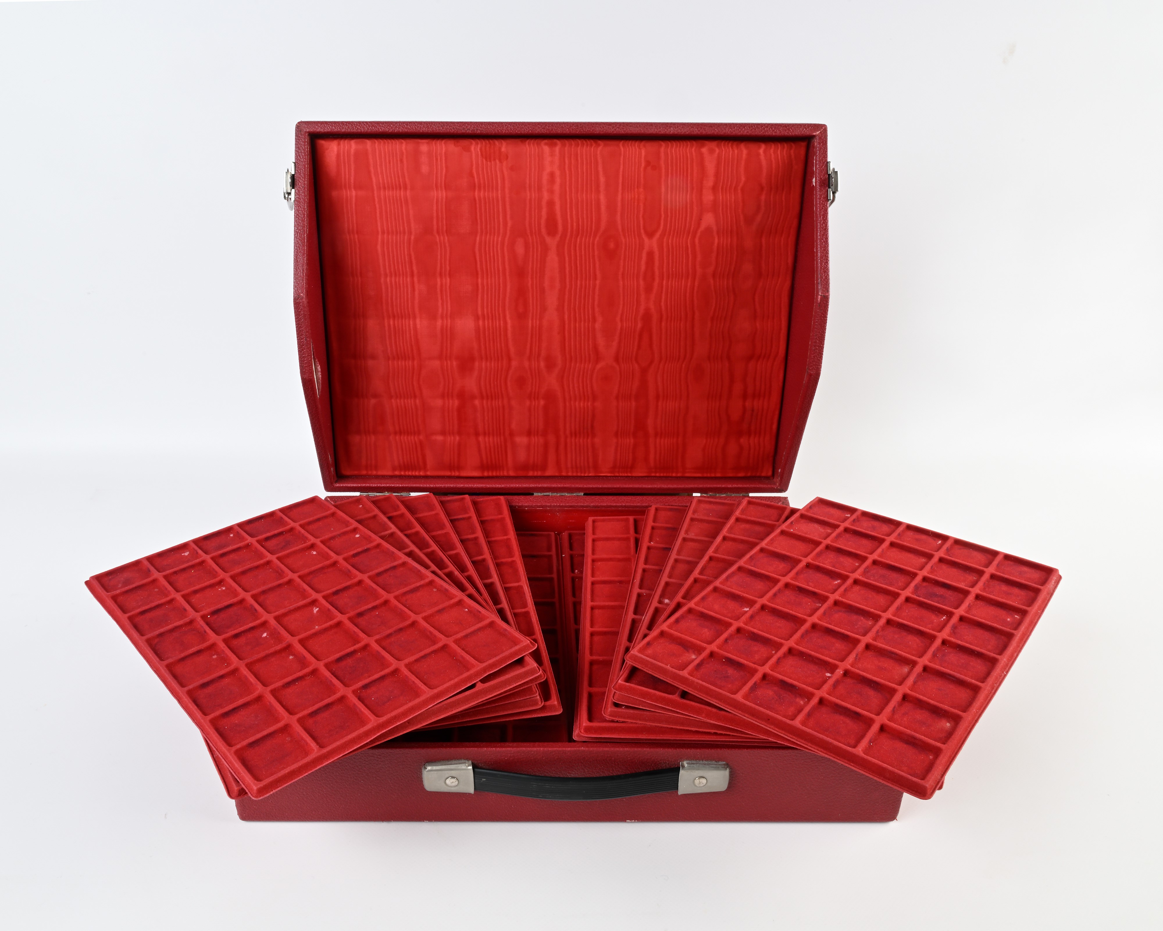 Valigetta portamonete di legno rivestita in similpelle con 20 vassoi (40 scomparti l'uno) rivestiti di feltro