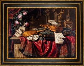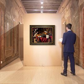 L’opera si distingue per la tavolozza scura e ricca, tratto distintivo di Manieri, e per l’uso di pesanti drappeggi in broccato, elemento ricorrente nelle sue composizioni, funzionale ad accentuare il senso di opulenza e teatralità della scena.