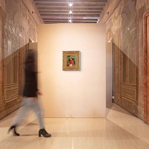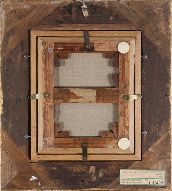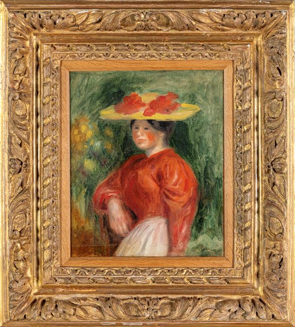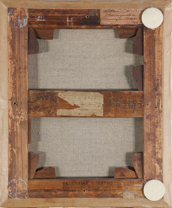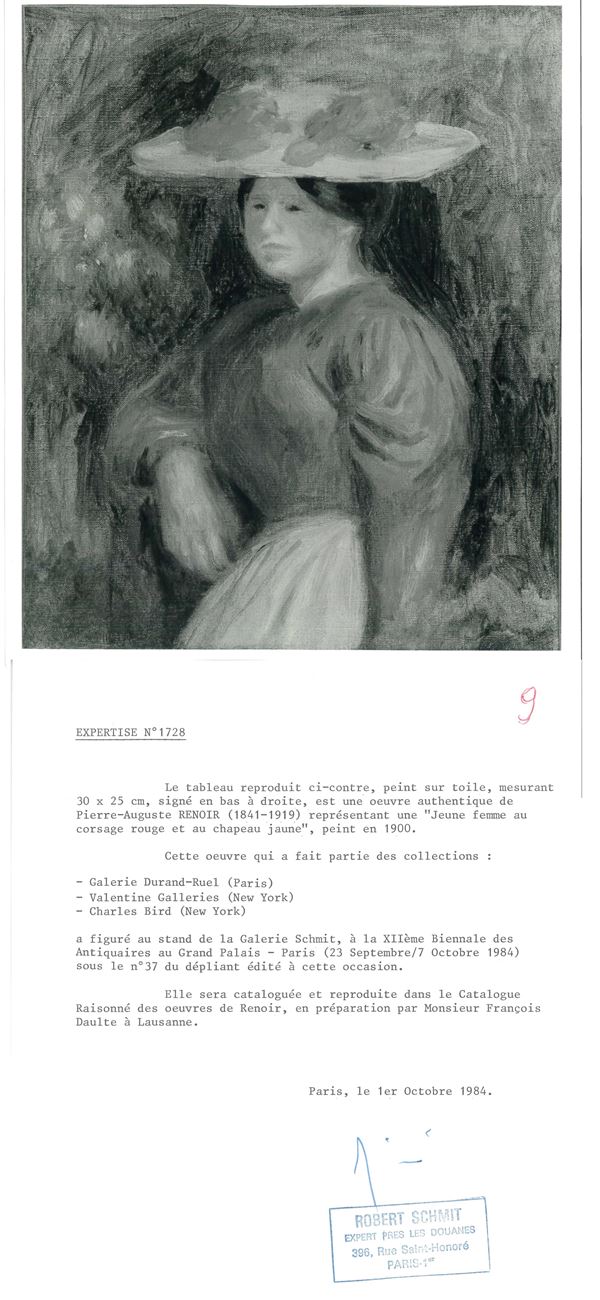 Sul retro: sul telaio: antico cartellino manoscritto Renoir (Nº) … 70 / Jeune femme / corsage rouge – I … / MA 2 … ; antico cartellino manoscritto Renoir no 6806 / … femme, corsage / … 1900; timbro VALENTINE GALLERY / 16 East 57th Street; antiche scritte e numeri di riferimento. Sulla cornice cartellino della ditta di trasporti d’arte Royer di Parigi con il nome dell’autore, numero di riferimento (03013) e data (18/12/84).