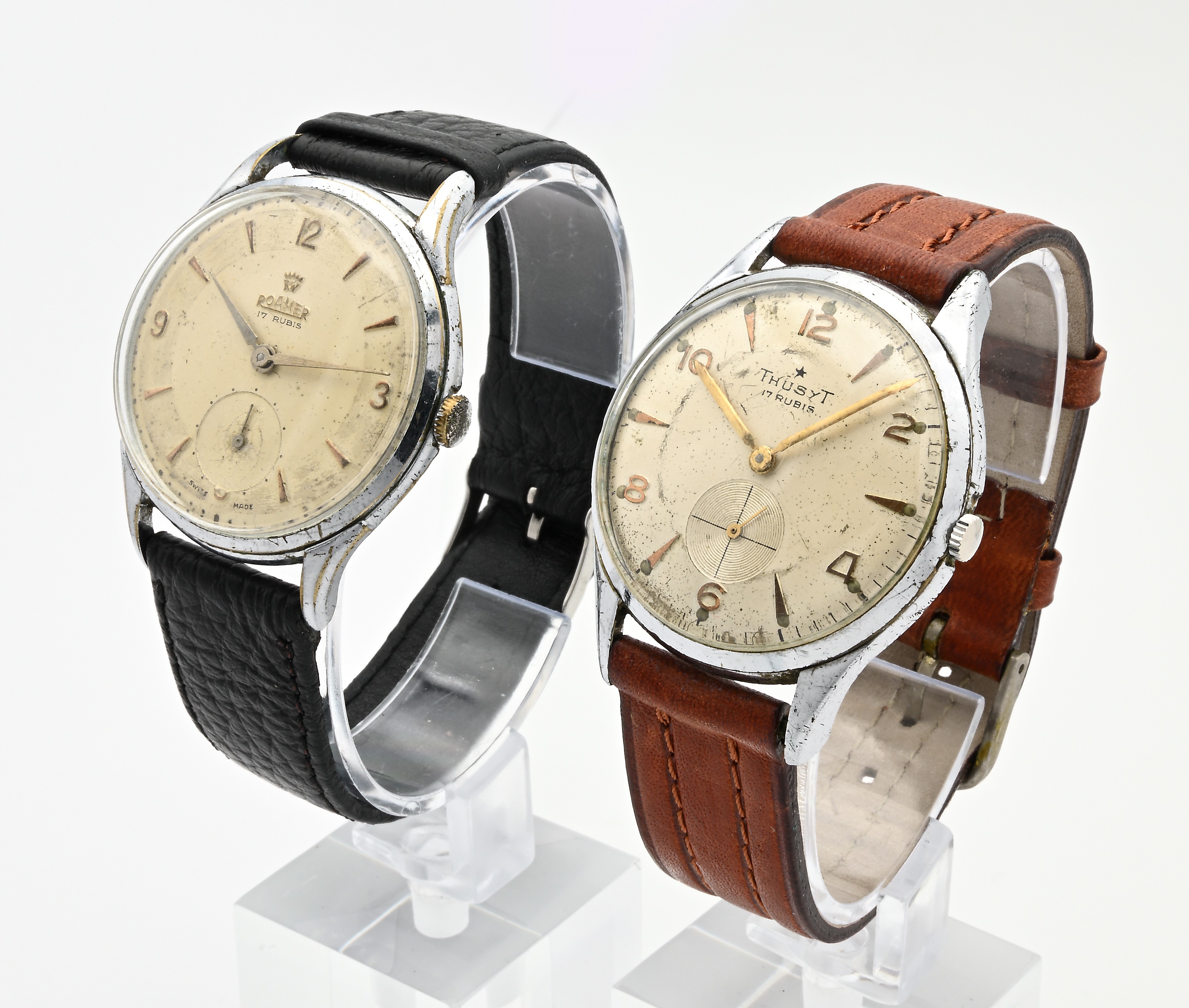 2 Orologi da polso a carica meccanica da uomo in metallo cromato con fondelli in acciaio 17 rubini: Thusyt e Roamer, anni '60