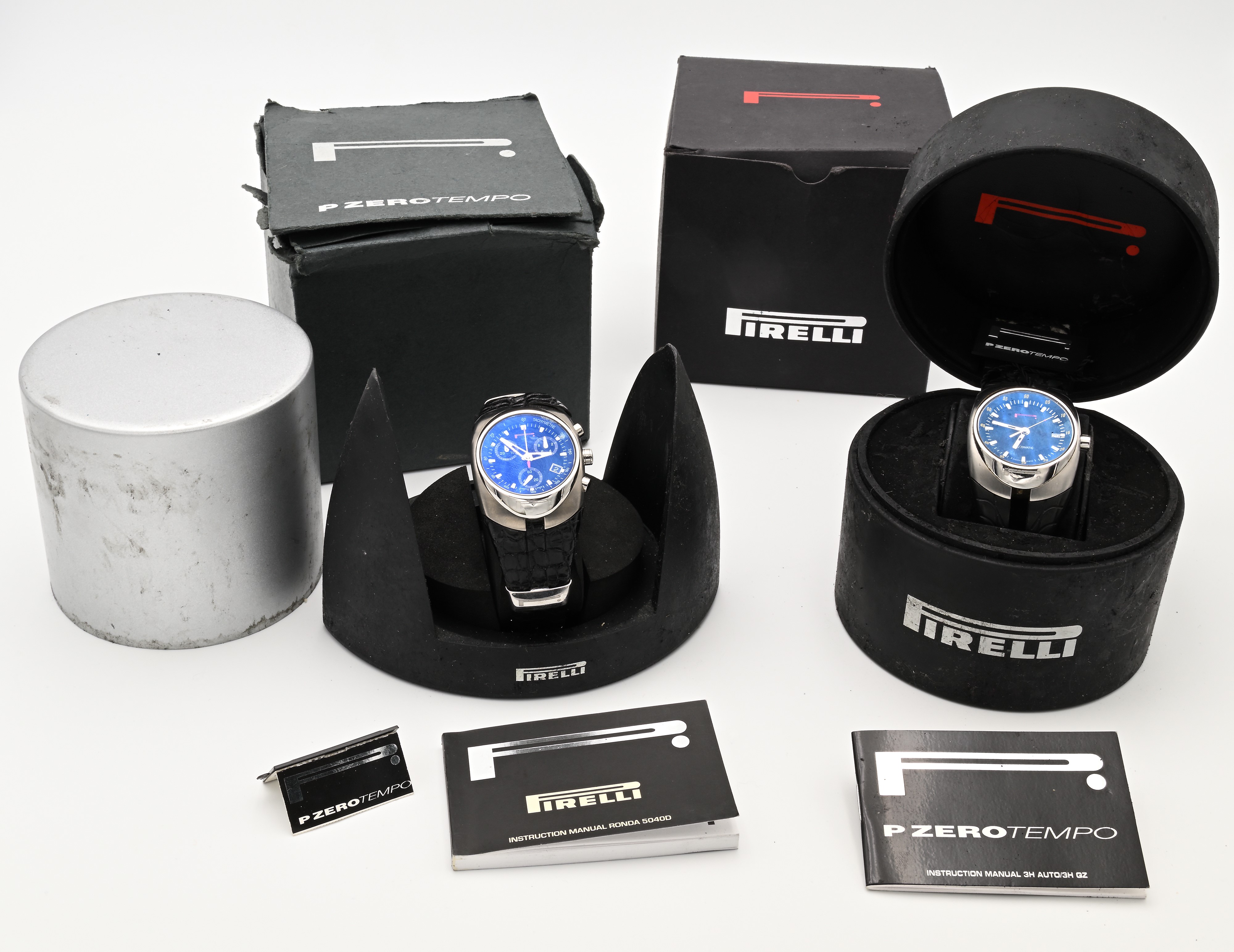 2 Orologi da polso da uomo Pirelli: PZero Tempo 3H Auto - Automatico in acciaio con datario; Water Resistant 100mt, con cinturino in caucciù e deployant; PZero Tempo Ronda 5040D Cronografo con datario al quarzo in acciaio e titanio. Water Resistant 100mt, con cinturino in pelle e deployant, anni 2000