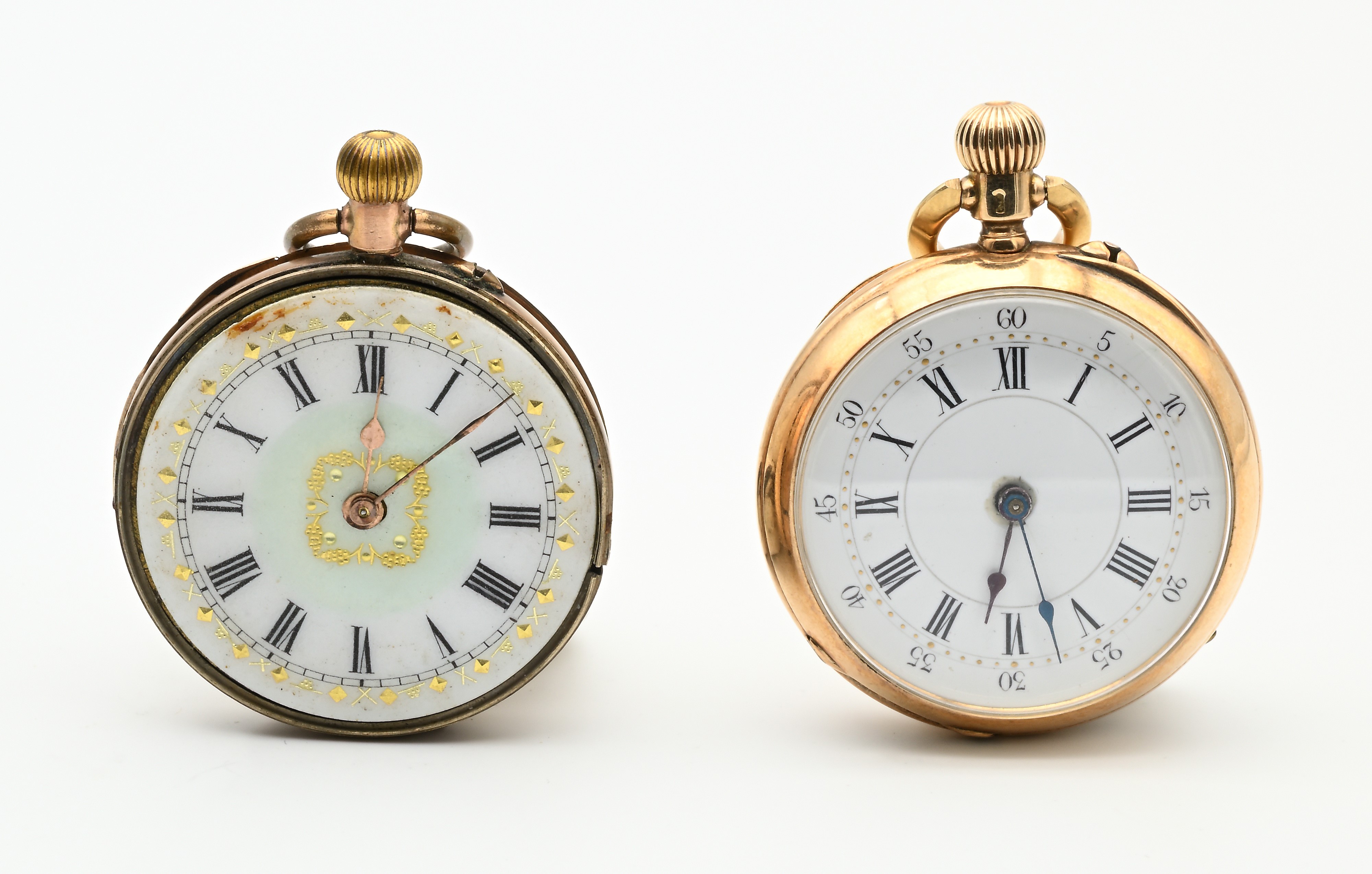 2 Piccoli orologi da tasca a carica remontoir con cassa in oro 14Kt e 9Kt decorata a guilloché ed incisioni a volute (il 2° con difetti e mancanze). Scappamento ad ancora, 1890 circa