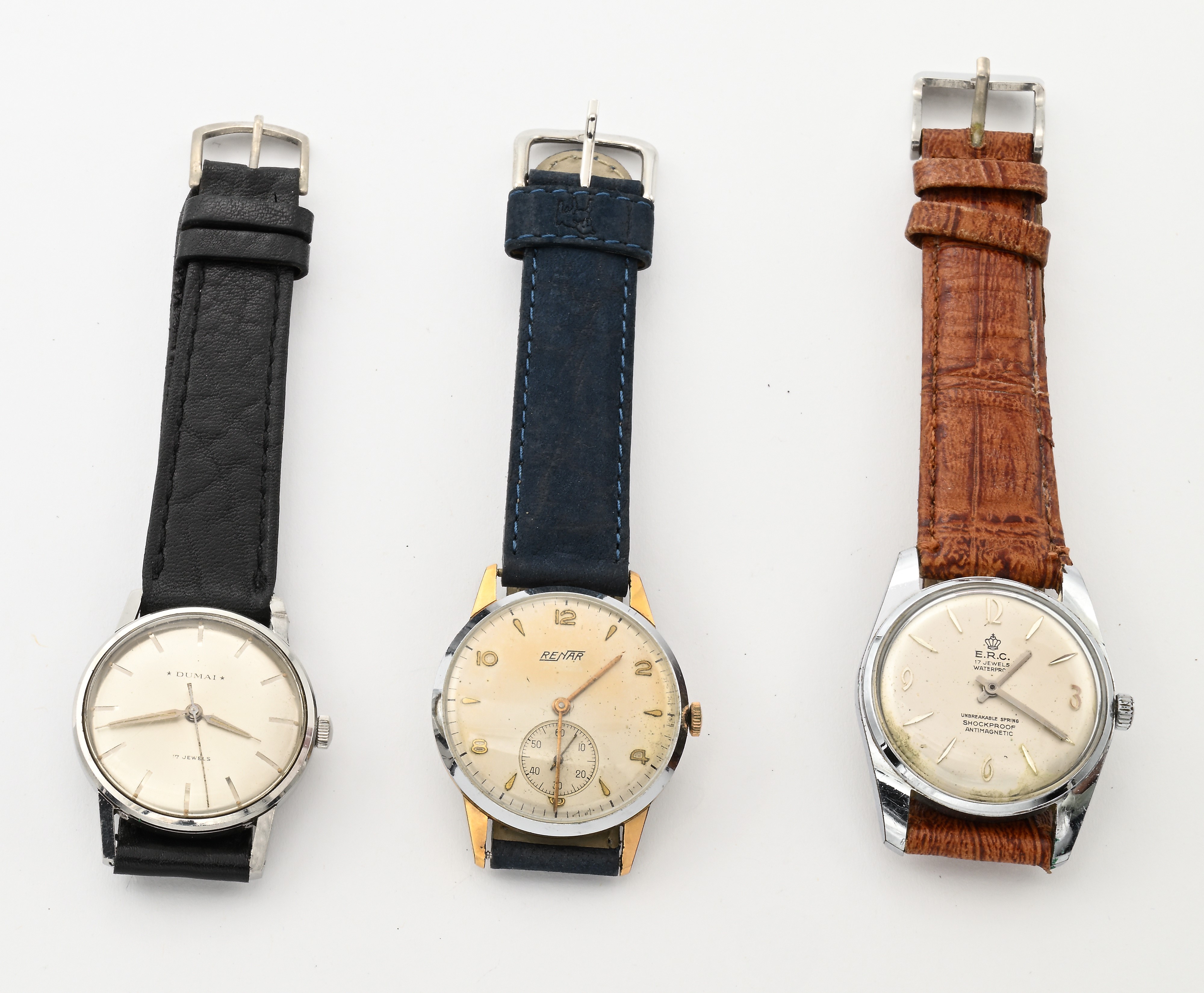 3 Orologi da polso a carica manuale da uomo, 17 rubini, in metallo cromato con fondelli in acciaio: E.R.C. e Dumai 6.10.111 Waterproof Antimagnetic Incabloc; Renair Wintex (placcato in oro giallo 10M), anni '50/'60