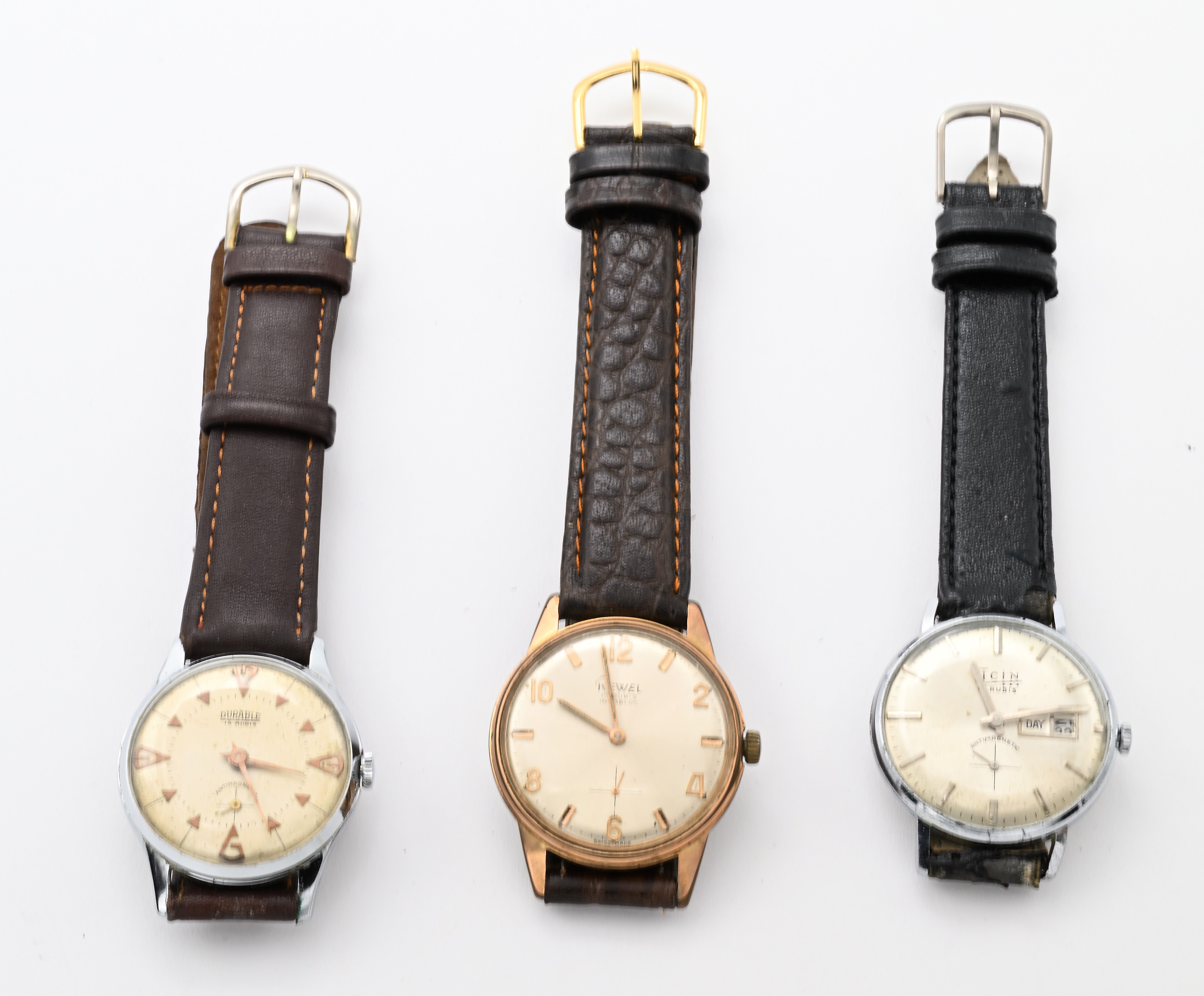 3 Orologi da polso a carica meccanica da uomo Antimagnetic: Ticin 6372 day-date 17 rubini; Rewell 52560 Incabloc Water protected; Durable 15 rubini, anni '50/'60