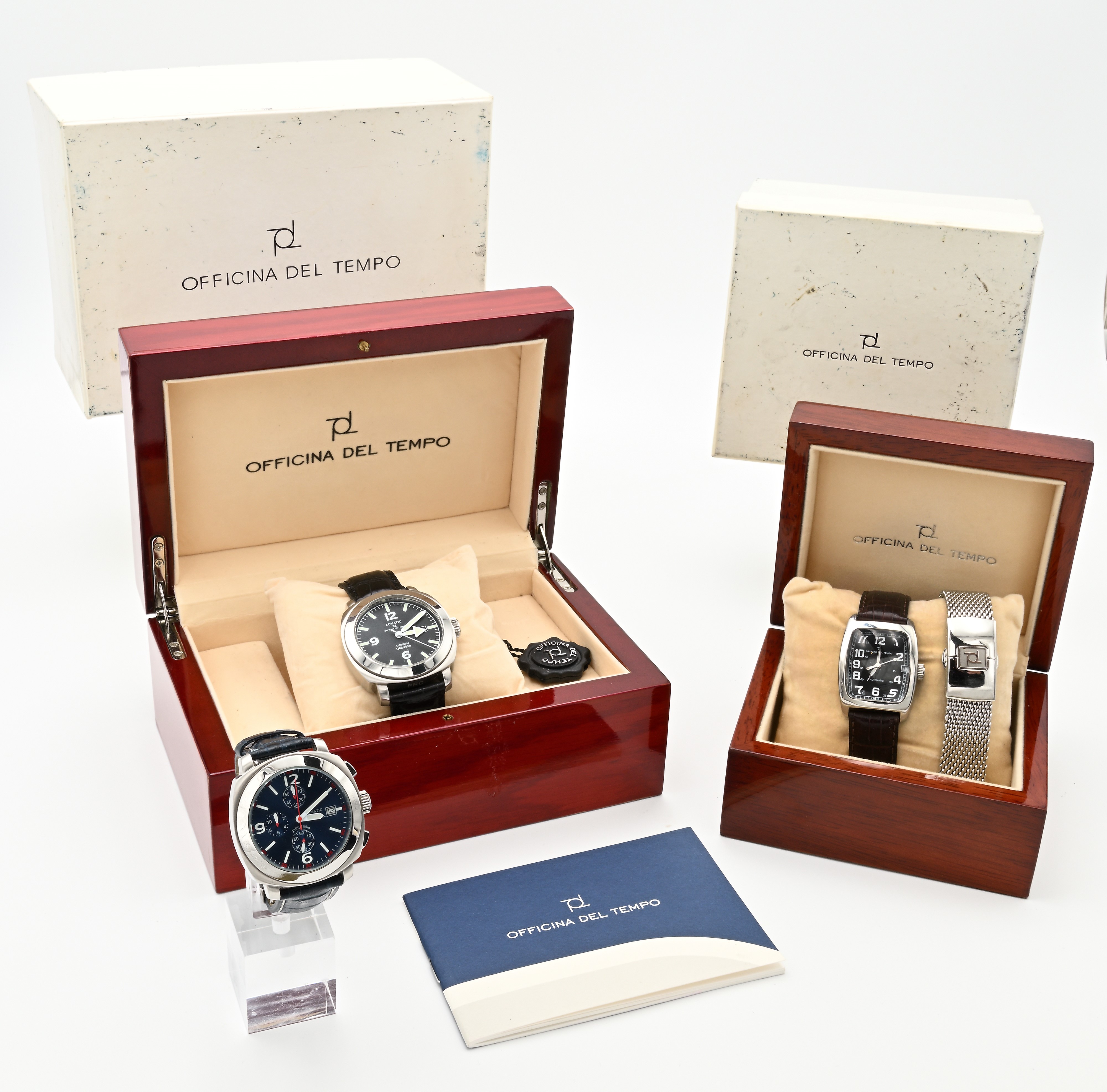 3 orologi da polso da uomo Officine del Tempo: Lumatic - automatico con datario in acciaio; Lumatic - cronografo con datario al quarzo in acciaio. Con cinturino e deployant originali; Automatic 316L Orologio da polso automatico da uomo in acciaio con fondello scheletrato. Cinturino in pelle con deployant e bracciale in acciaio originali, anni 2000