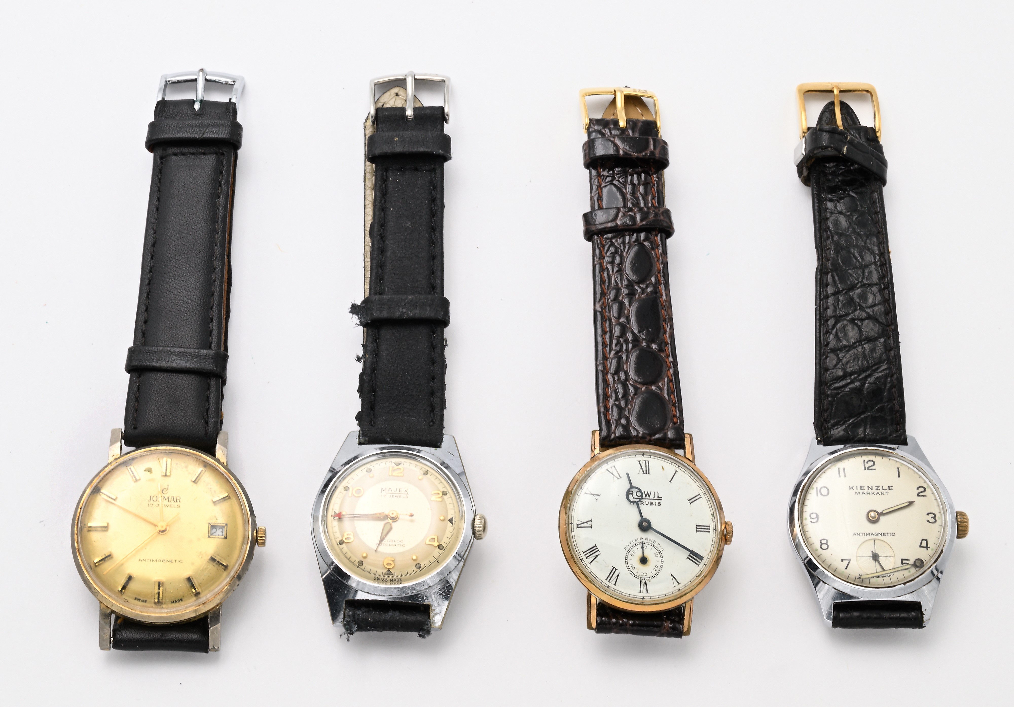 4 Orologi da polso da uomo in metallo cromato e placcato in oro giallo con fondelli in acciaio: Majex automatic 17 Jewels Antimagnetic Incabloc Waterproof; Kienzle Markant Antimagnetic Waterproof; Rowil Antimagnetic 17 rubini; Josmar Antimagnetic 17 rubini con datario a carica manuale, anni '50/'60