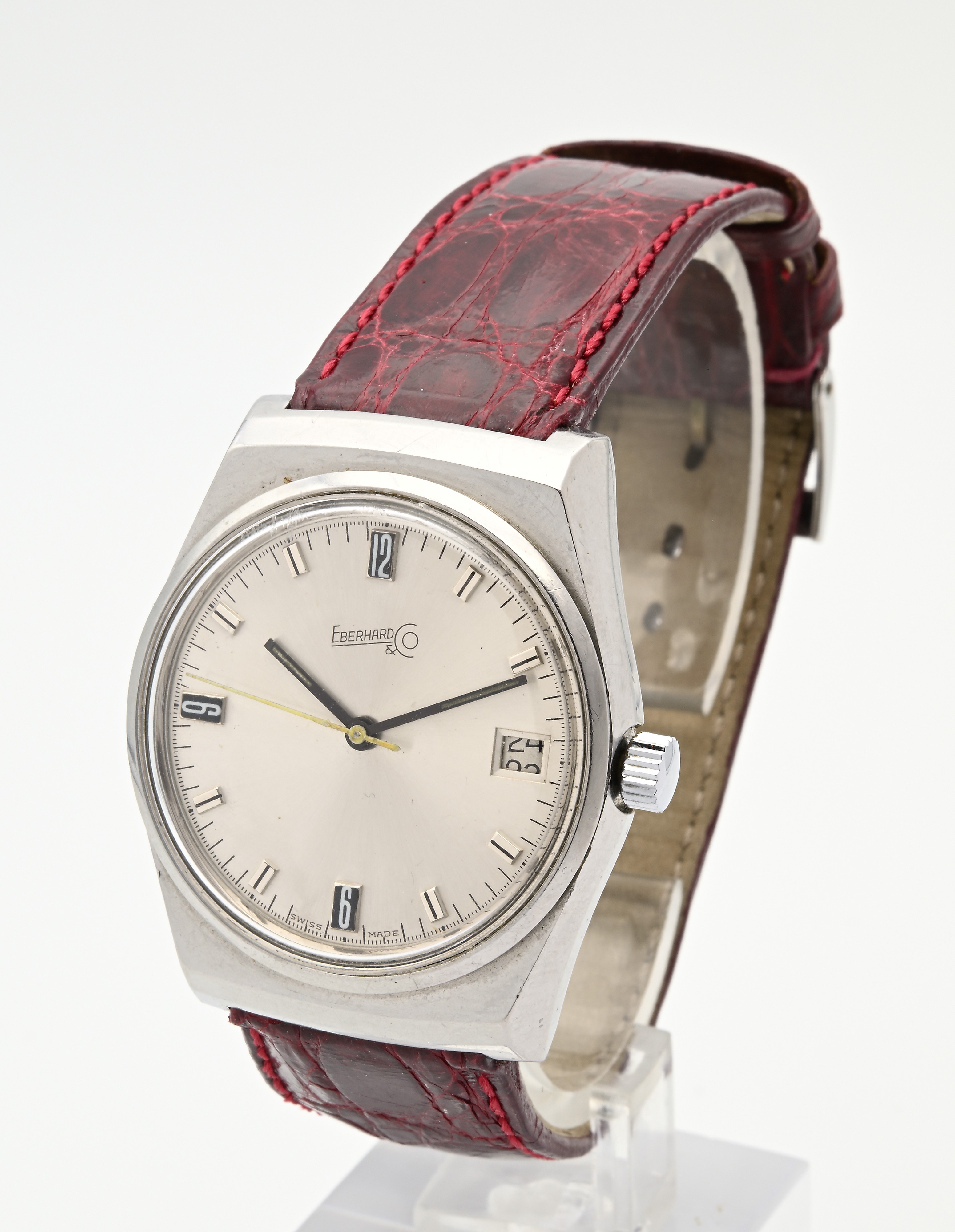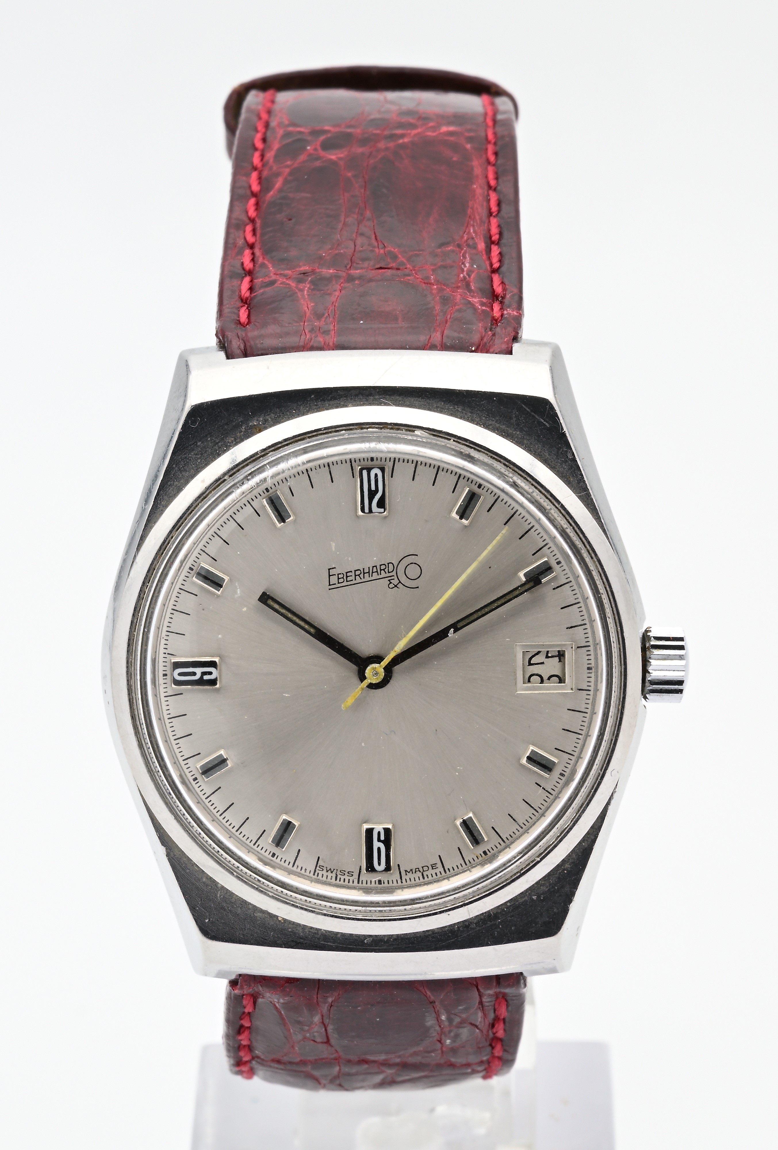 Eberhard Ref. 1605-51 - Orologio da polso da uomo a carica manuale con datario in acciaio, con logo pubblicitario inciso sul fondello, anni '70