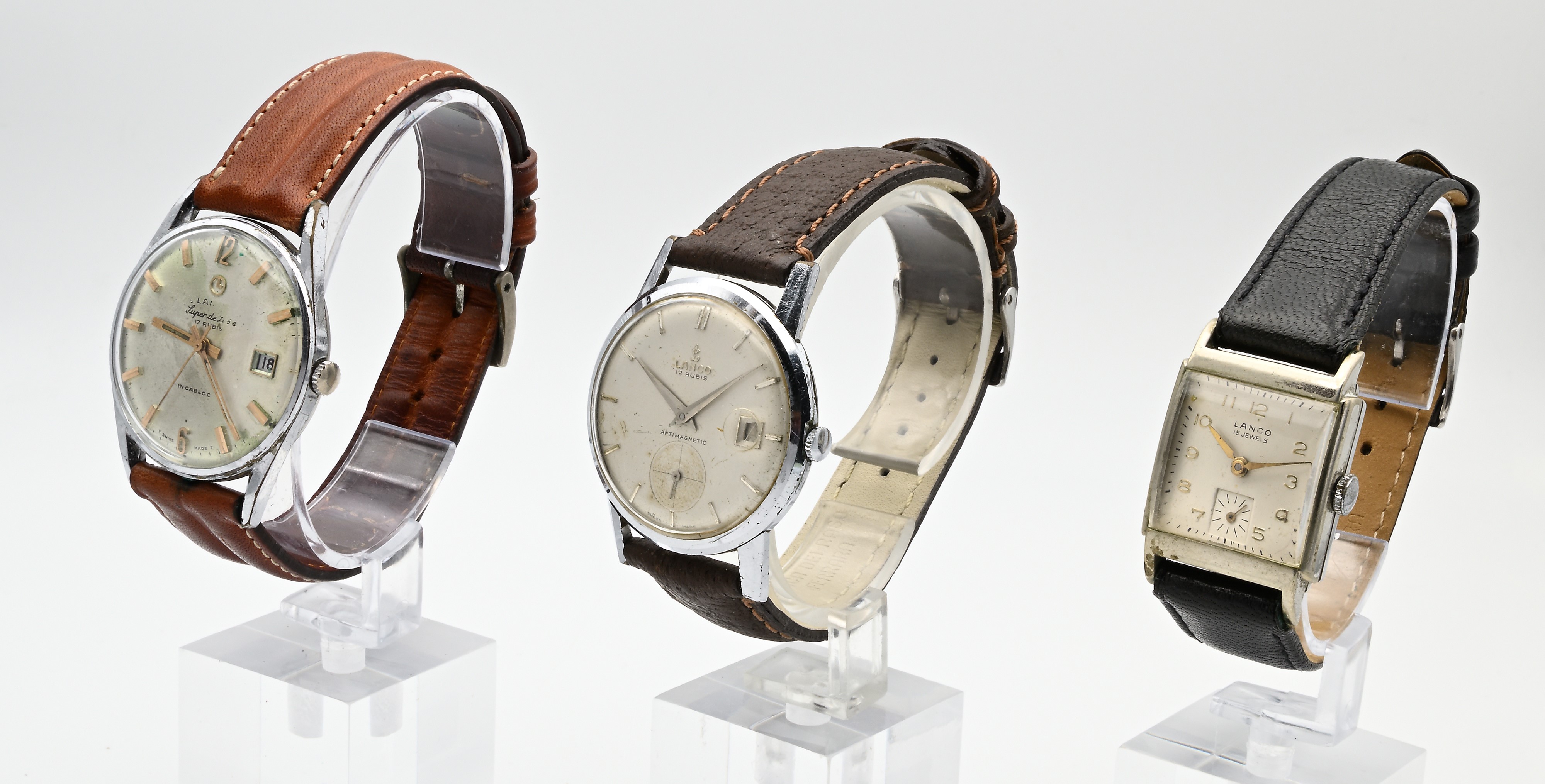 Lanco - 3 Orologi da polso a carica meccanica da uomo in metallo cromato con fondello in acciaio: Lanco 607 (Cal. 1336) con datario, 17 rubini. Antimagnetic; Lanco Super Deluxe 360 con datario, 17 rubini, Incabloc, Antimagnetic; Lanco 15 rubini di forma, anni '60