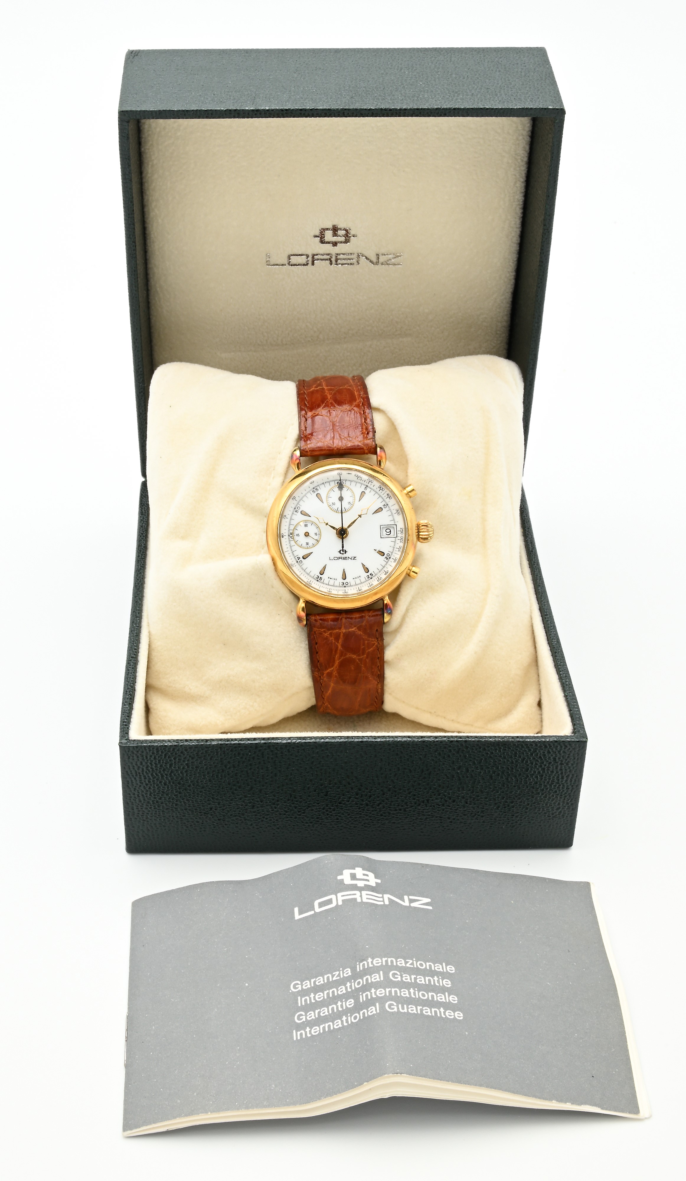Lorenz 10847 - Orologio da polso cronografo con meccanismo Eta Valjoux 7765 da uomo in metallo placcato oro con fondello in acciaio, 1986