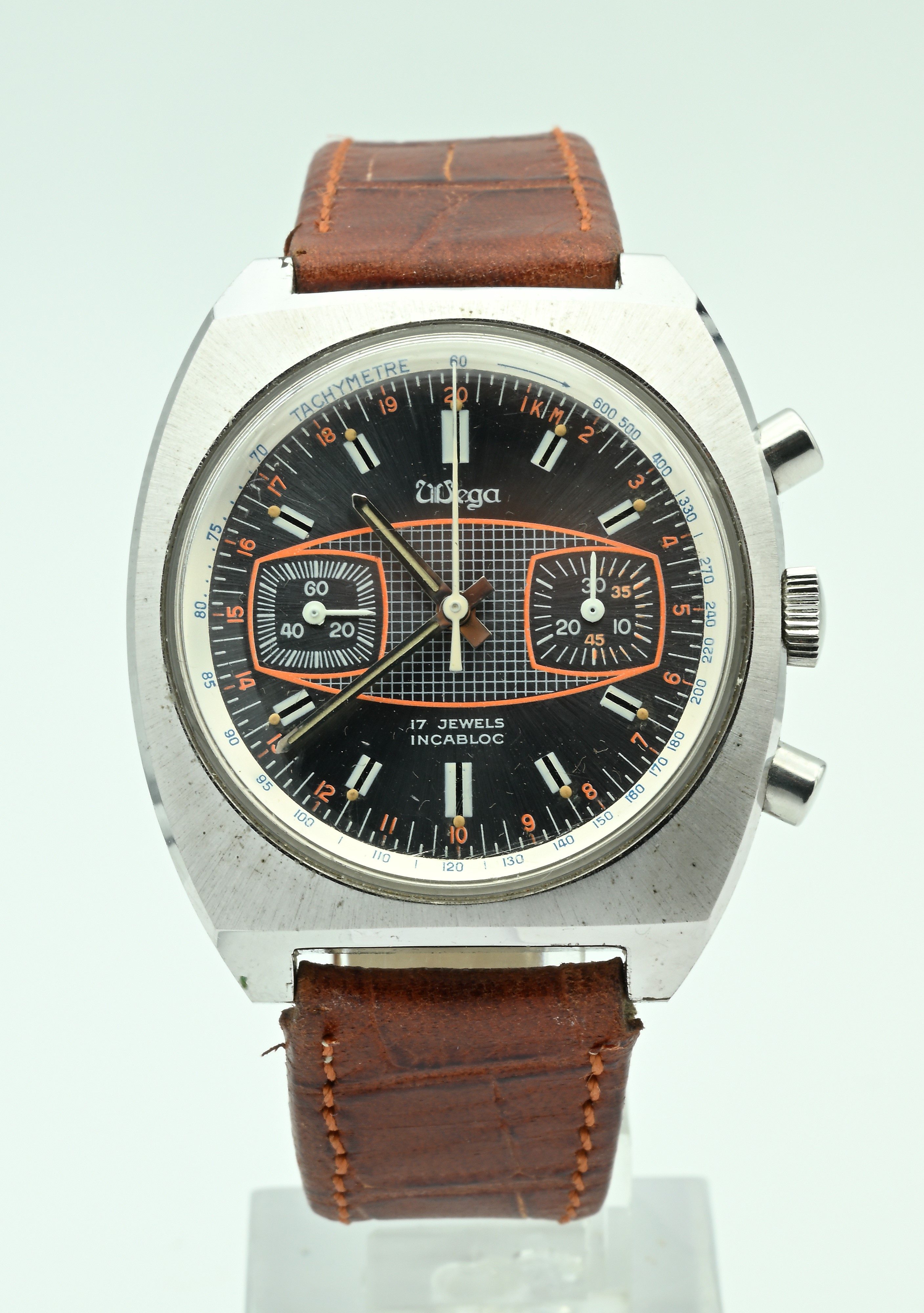 Wega 2250 - Orologio da polso cronografo da uomo con meccanismo a carica manuale ETA 7733. Cassa in metallo cromato e fondello in acciaio, anni '70