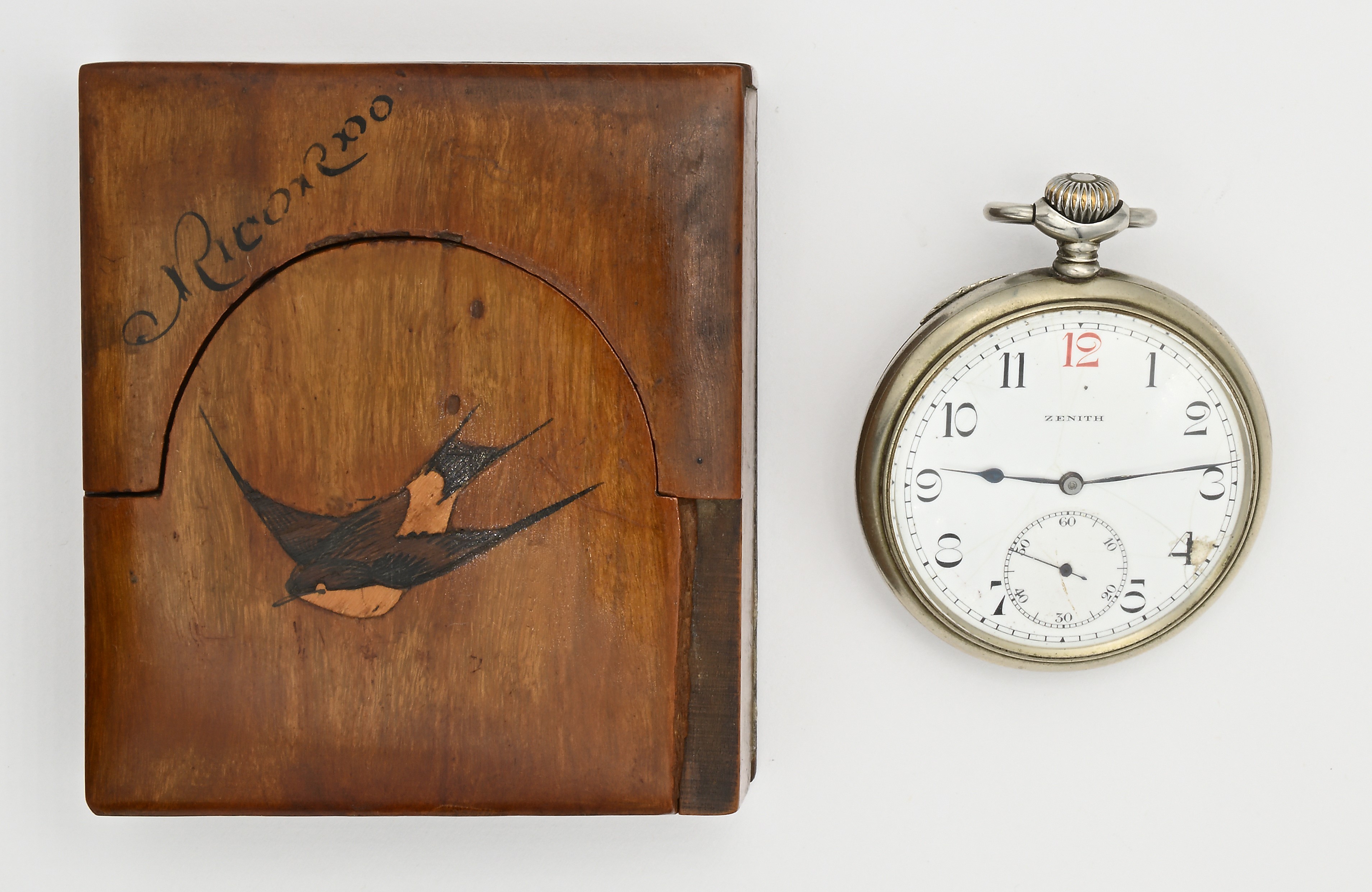 Funzionante. Meccanismo firmato e numerato I 387783. Cassa e cuvette numerate 5128363549. Difetti allo smalto del quadrante e mancanza ad ore 4. Corredato di scatola portaorologio "sorrentina" in legno con rondine.