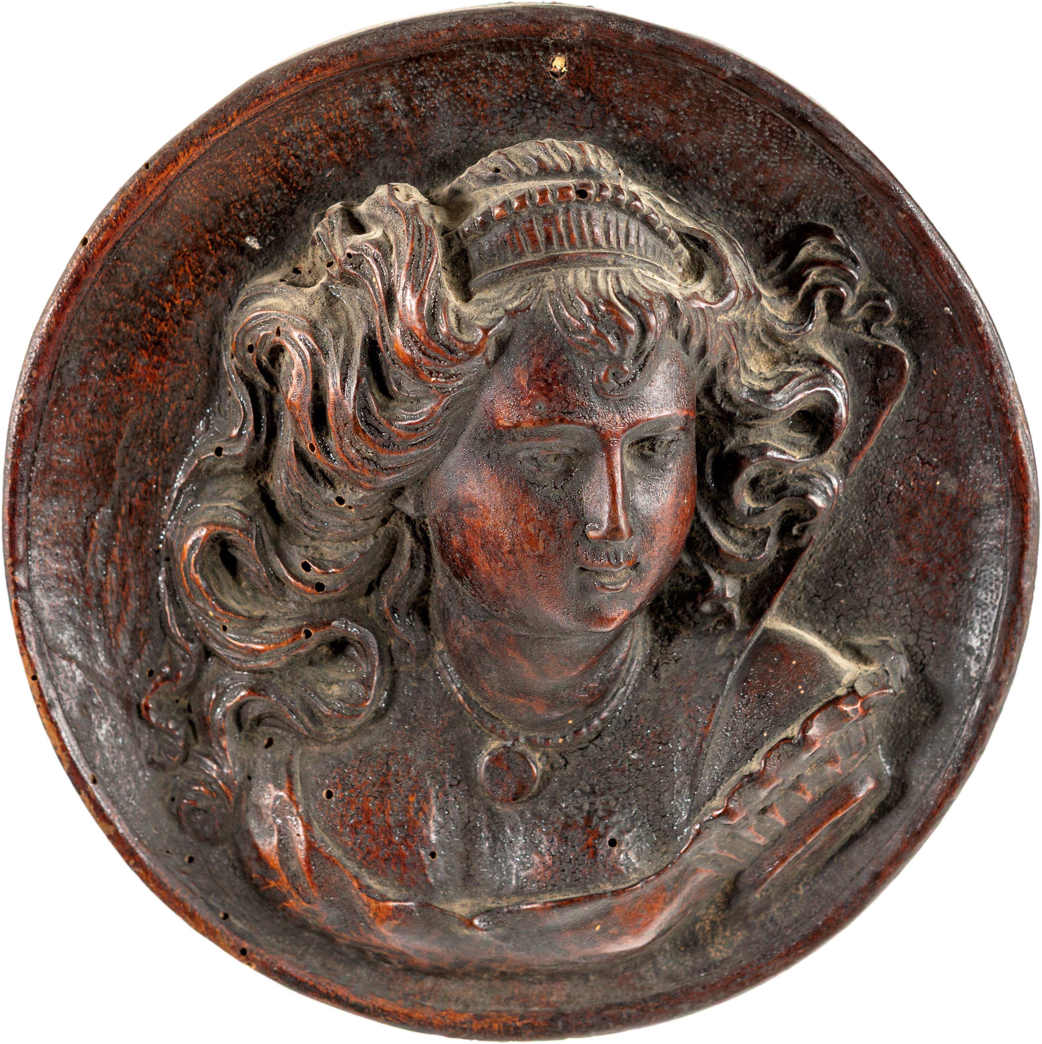 raffigurante busto femminile con diadema, capelli fluenti e girocollo con pendente