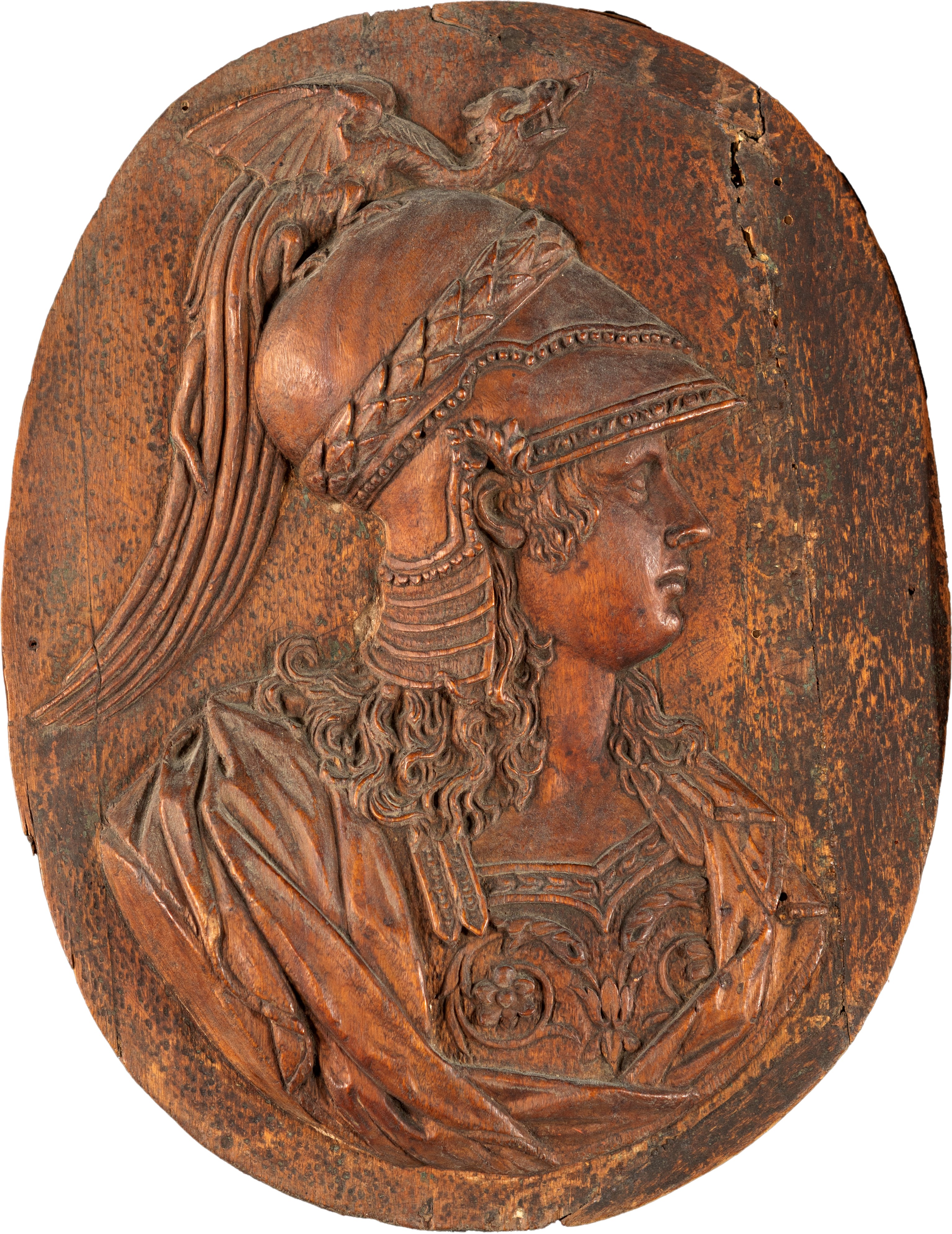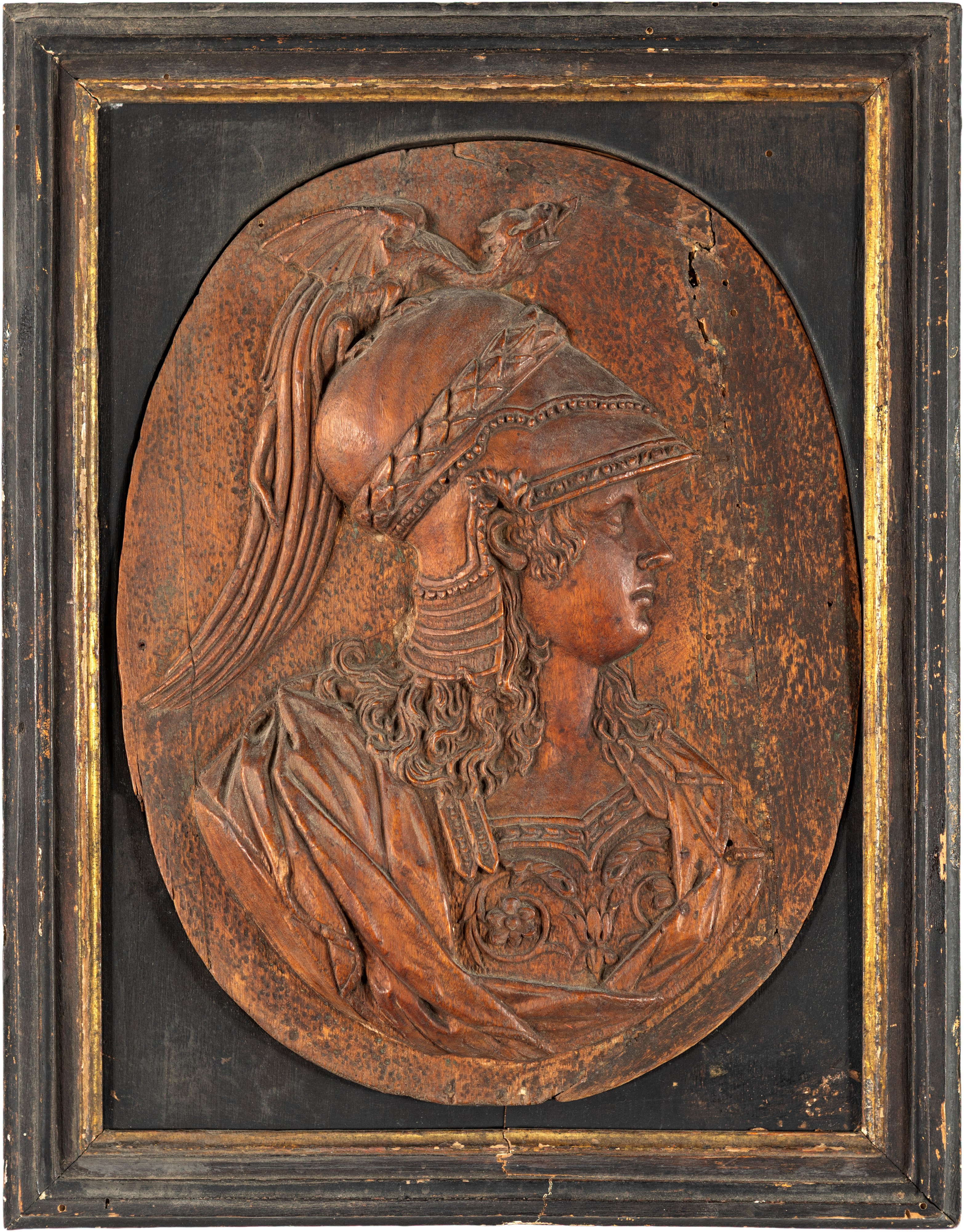 Bassorilievo ovale in legno intagliato raffigurante profilo di Minerva, periodo del Grand Tour, XIX secolo