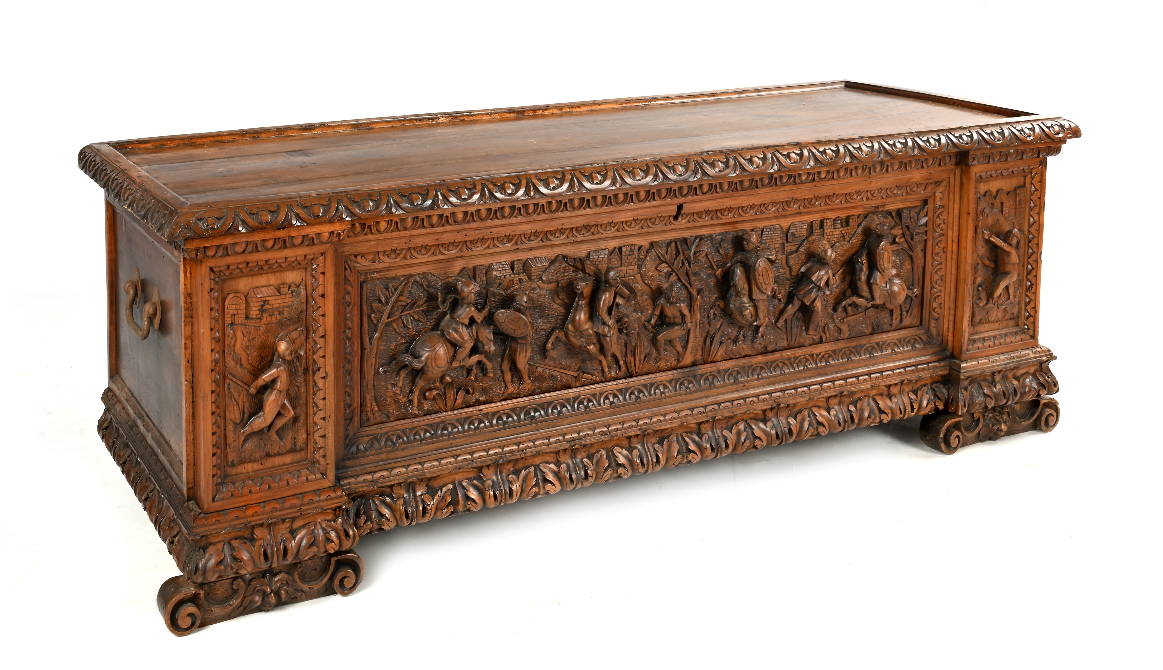 decorata in altorilievo da figure di cavalieri; maniglie laterali in ferro, piedi a mensola