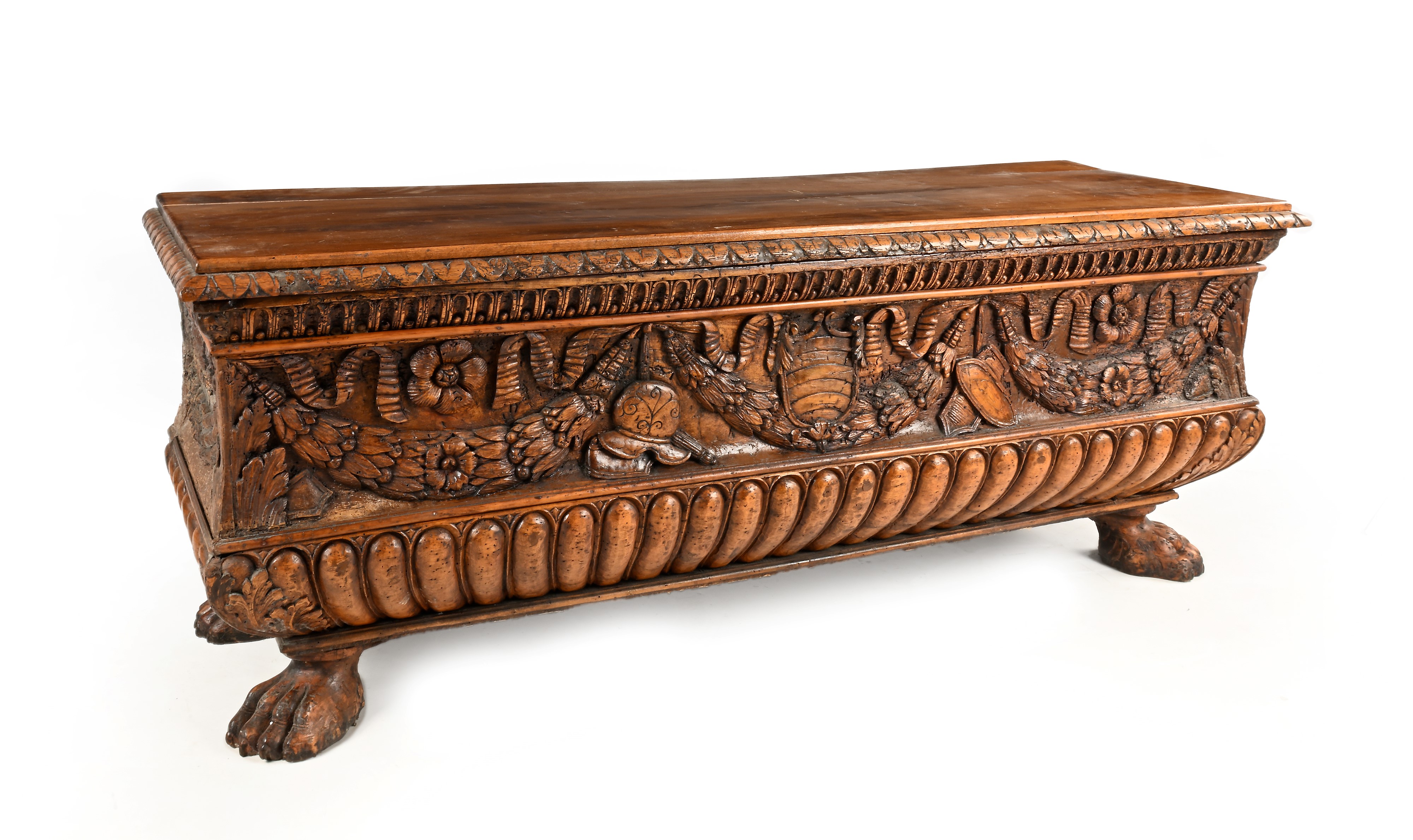 facciata decorata da uno stemma affiancato da festoni intagliati sospesi e trattenuti da un nastro pieghettato; profilo inferiore baccellato, piedi ferini