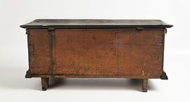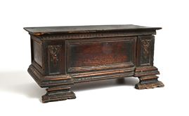 coperchio con serramenti in ferro, sottolineato da dentelli; facciata con specchiatura centrale delimitata da formelle con cascatelle intagliate in rilievo; piedi a mensola modanata. Difetti e restauri