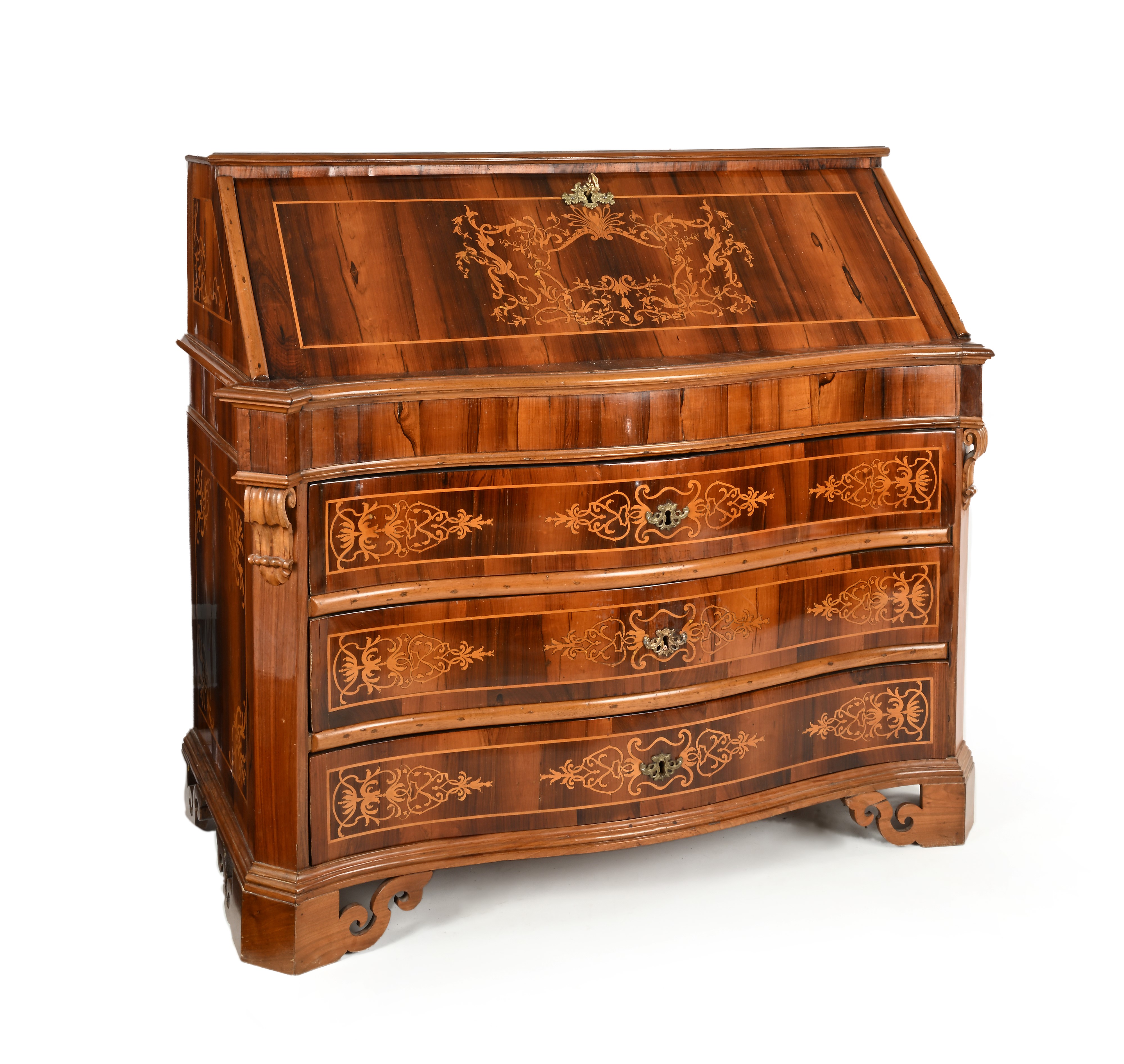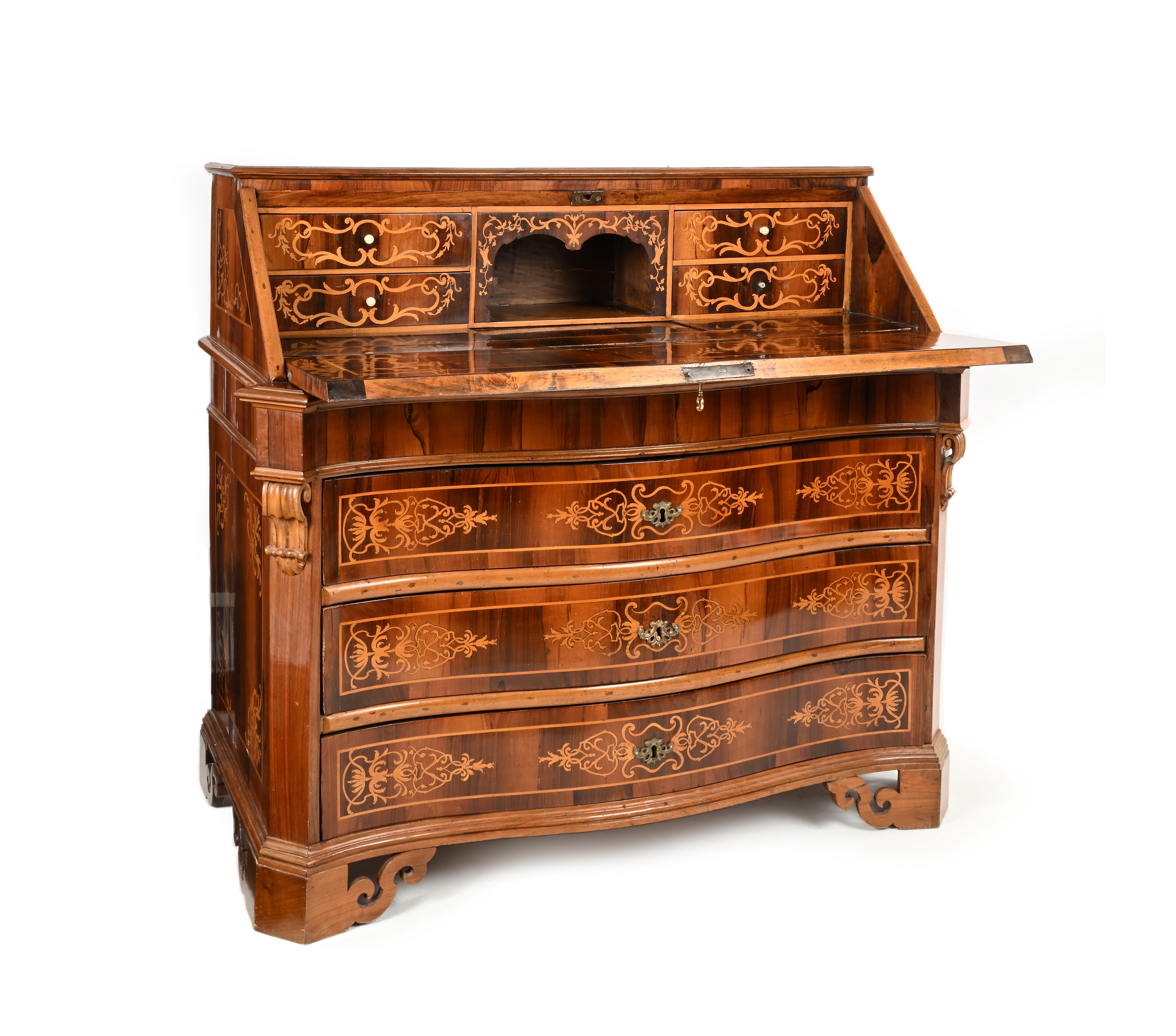 Cassettone a ribalta in noce con filettature ed intarsi, Roma, XVIII secolo