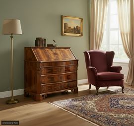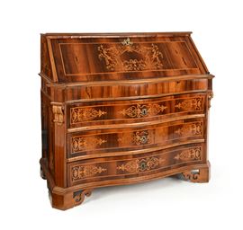facciata suddivisa in tre cassetti lievemente sagomati delimitati da paraste angolari rifinite da mensole di gusto architettonico poste sulla sommità; la ribalta cela un vano centrale affiancato da due cassetti in colonna disposti ai lati; piedi a mensola