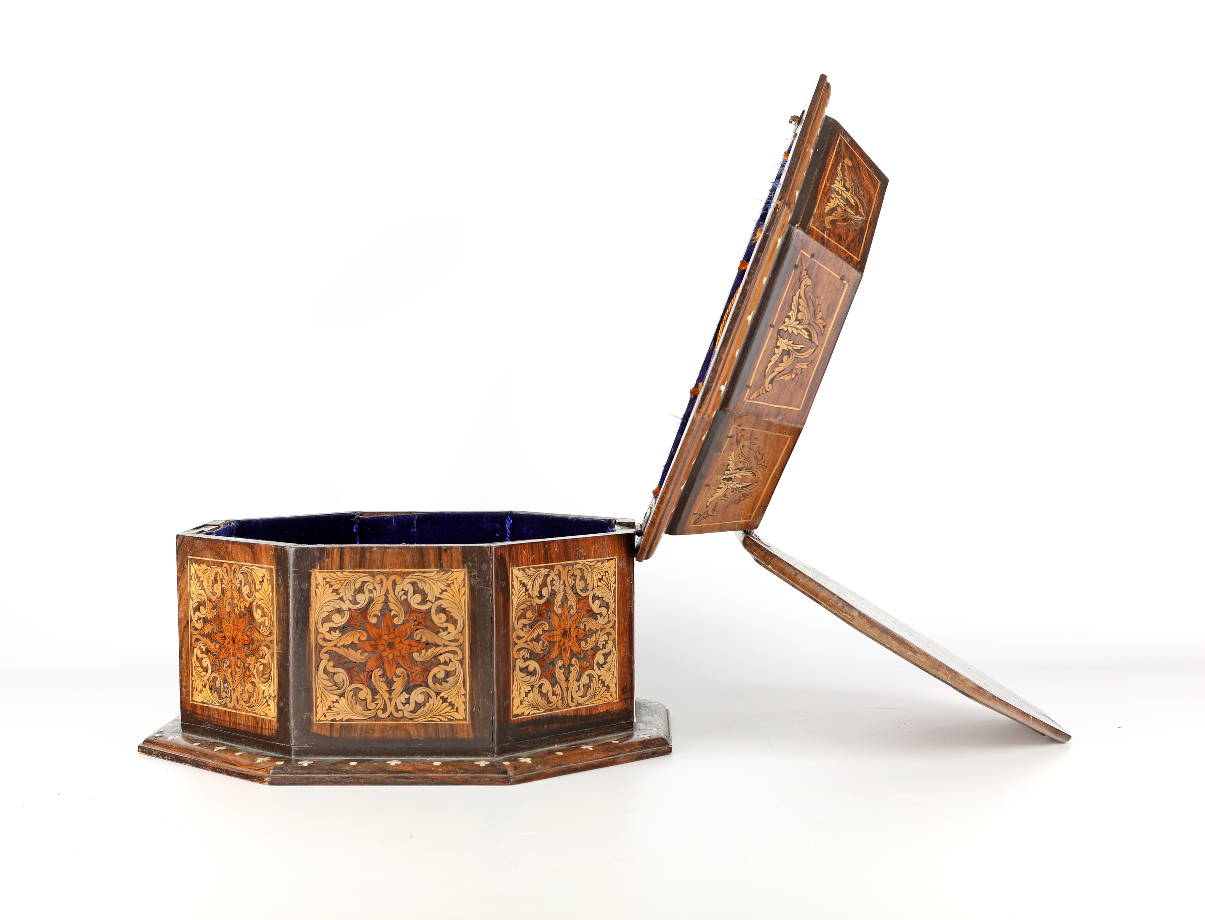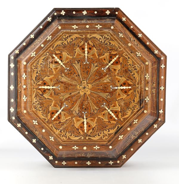 di forma ottagonale è interamente decorato da tarsie ispirate alla maniera dei fratelli Luigi e Angiolo Falcini. Coperchio apribile e sommità incernierata a celare un secondo scomparto, decorata da un fiore centrale circondato da otto farfalle; ogni facciata reca una grande corolla circondata da volute vegetali a coprire l'intero pannello