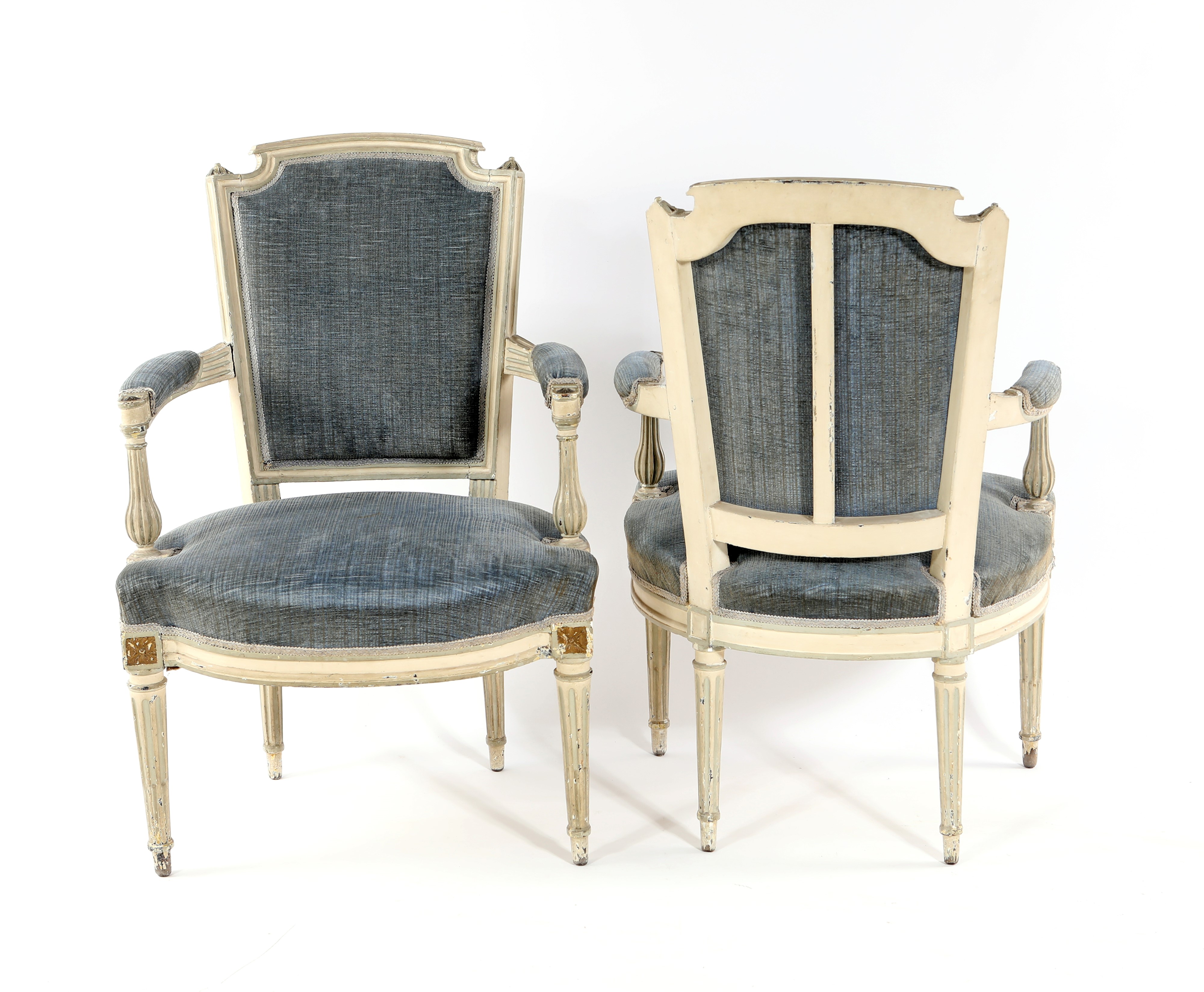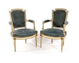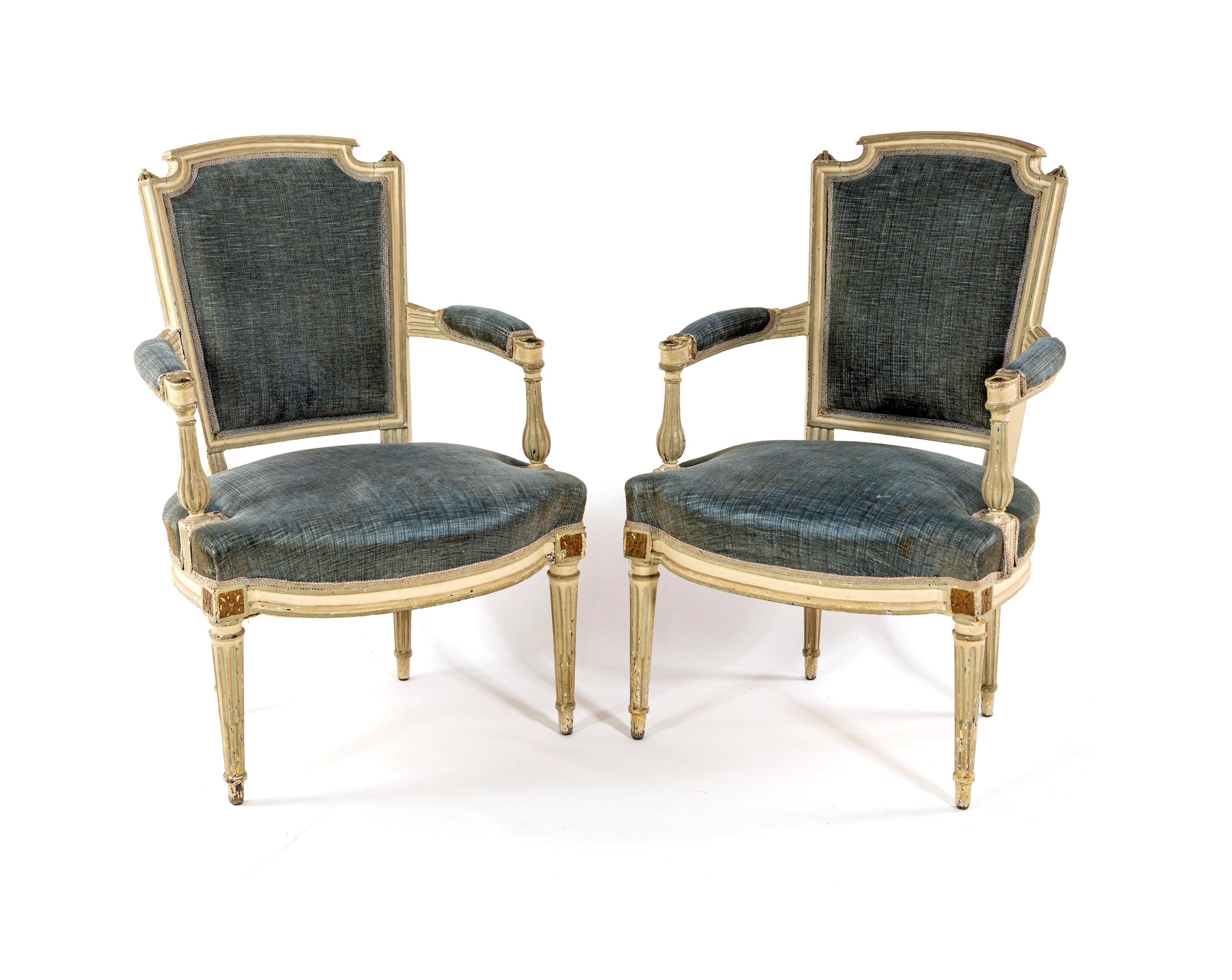 Coppia di poltroncine Luigi XVI in legno laccato bianco e oro, XIX secolo