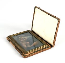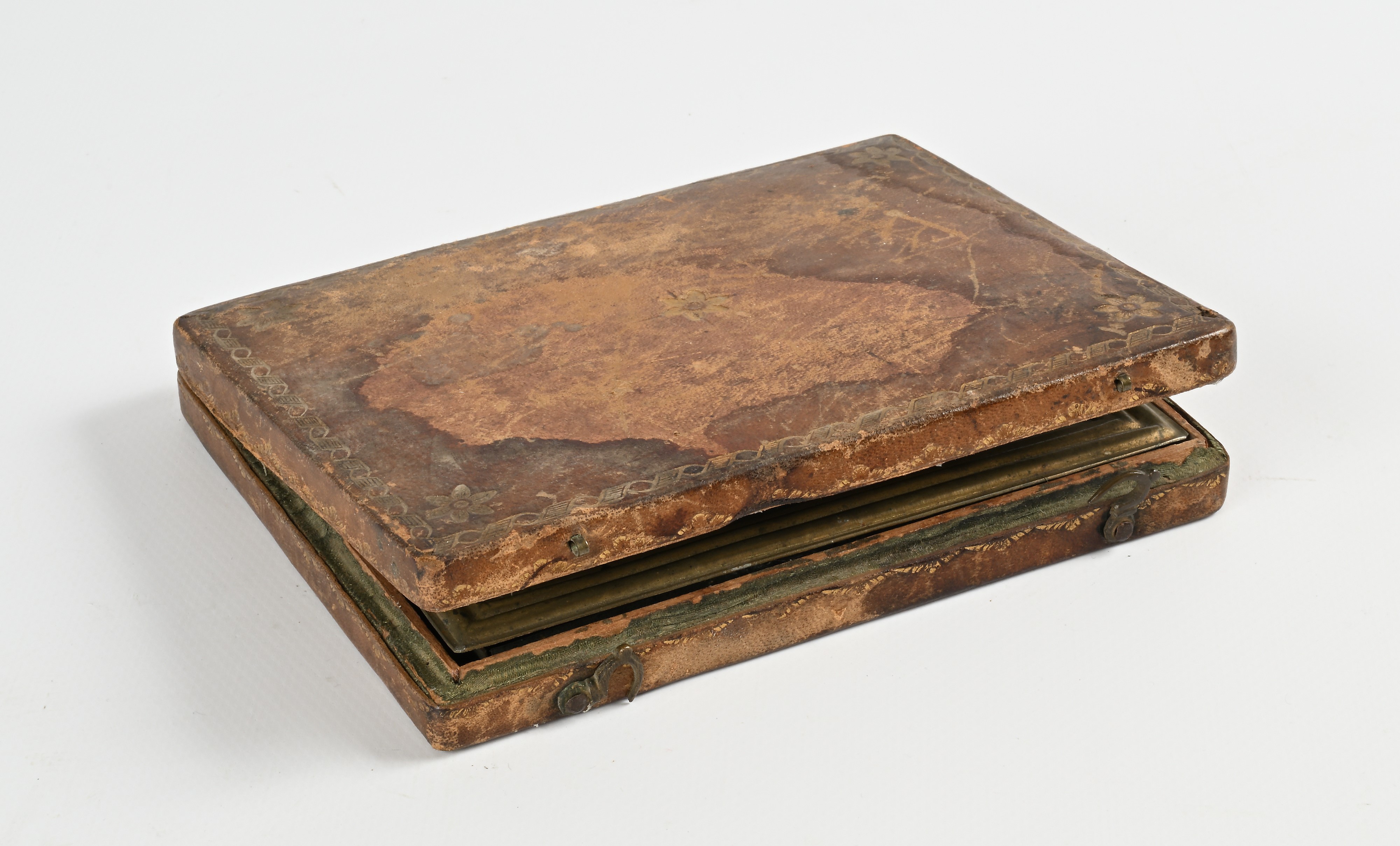 astuccio rivestito in pelle con corolla centrale ed angolari sovrimpresse in oro