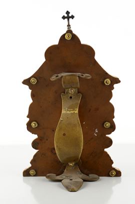 cornice architettonica di gusto sansoviniano con cariatidi ai lati e testa di cherubino sormontato da croce sulla sommità; al centro raffigurazione in lamina argentata dell’incredulità di San Tommaso; base gradinata