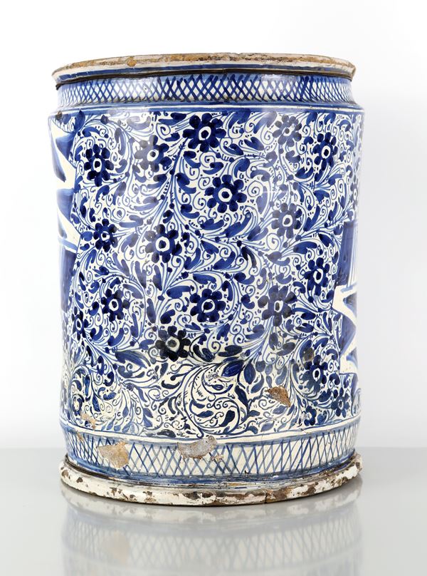 Grande albarello in maiolica bianca e blu, Liguria (?), XVII secolo