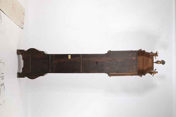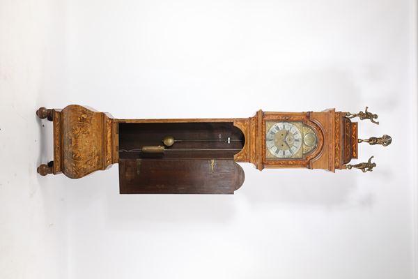 Grande orologio a torre in legno intarsiato, Inghilterra/Olanda, fine XVII/inizi XVIII secolo, orologiaio William Tomlinson Londra