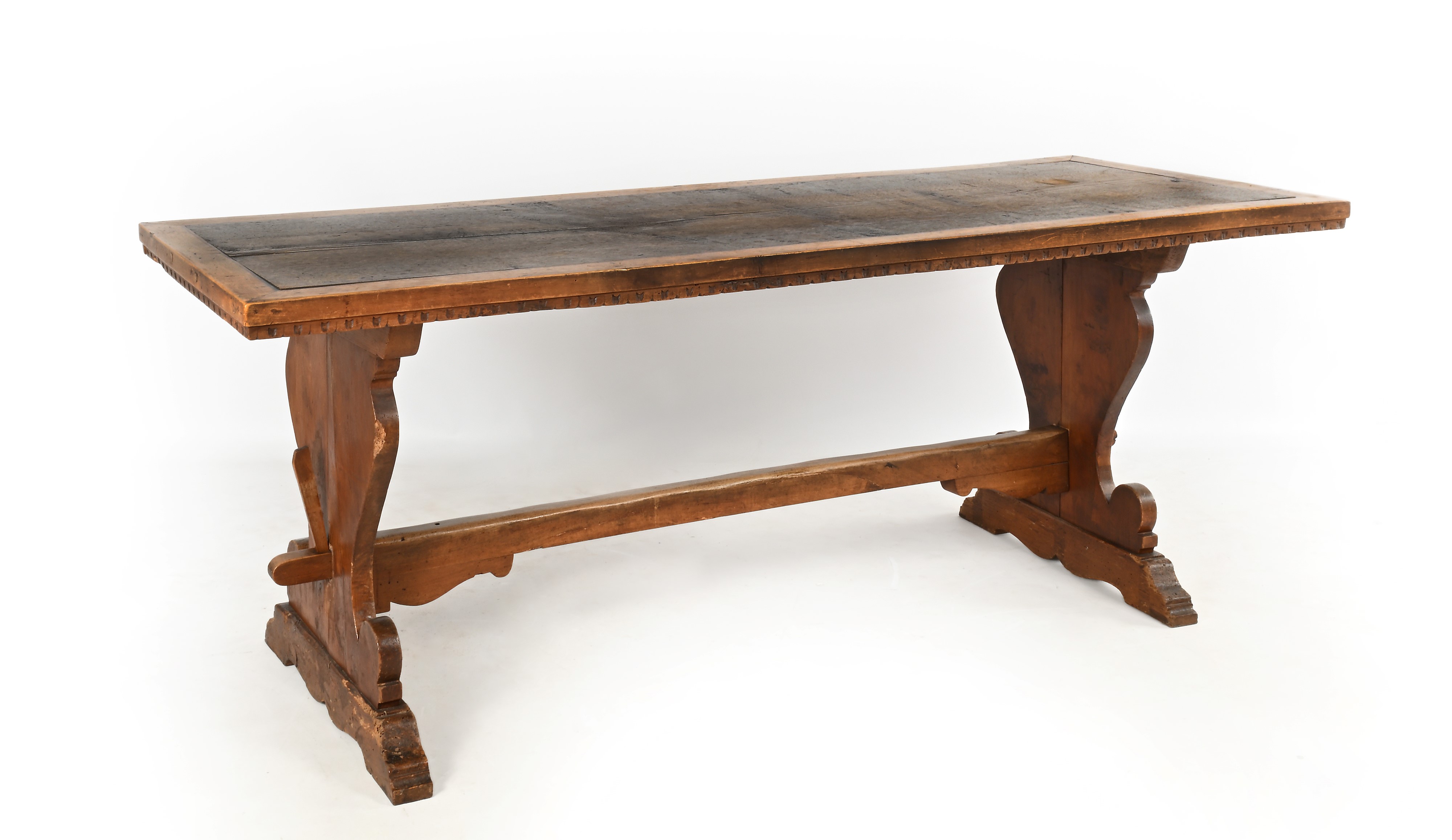 piano rettangolare con breve fascia percorsa da dentelli, sostegni ad asso di coppe riuniti da traversa