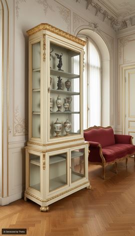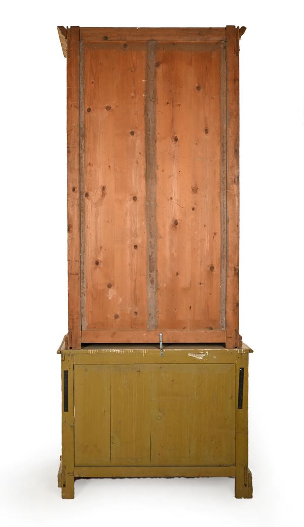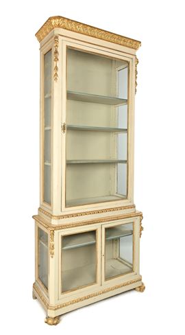 Grande vetrina a due corpi in legno laccato bianco e oro, XIX secolo