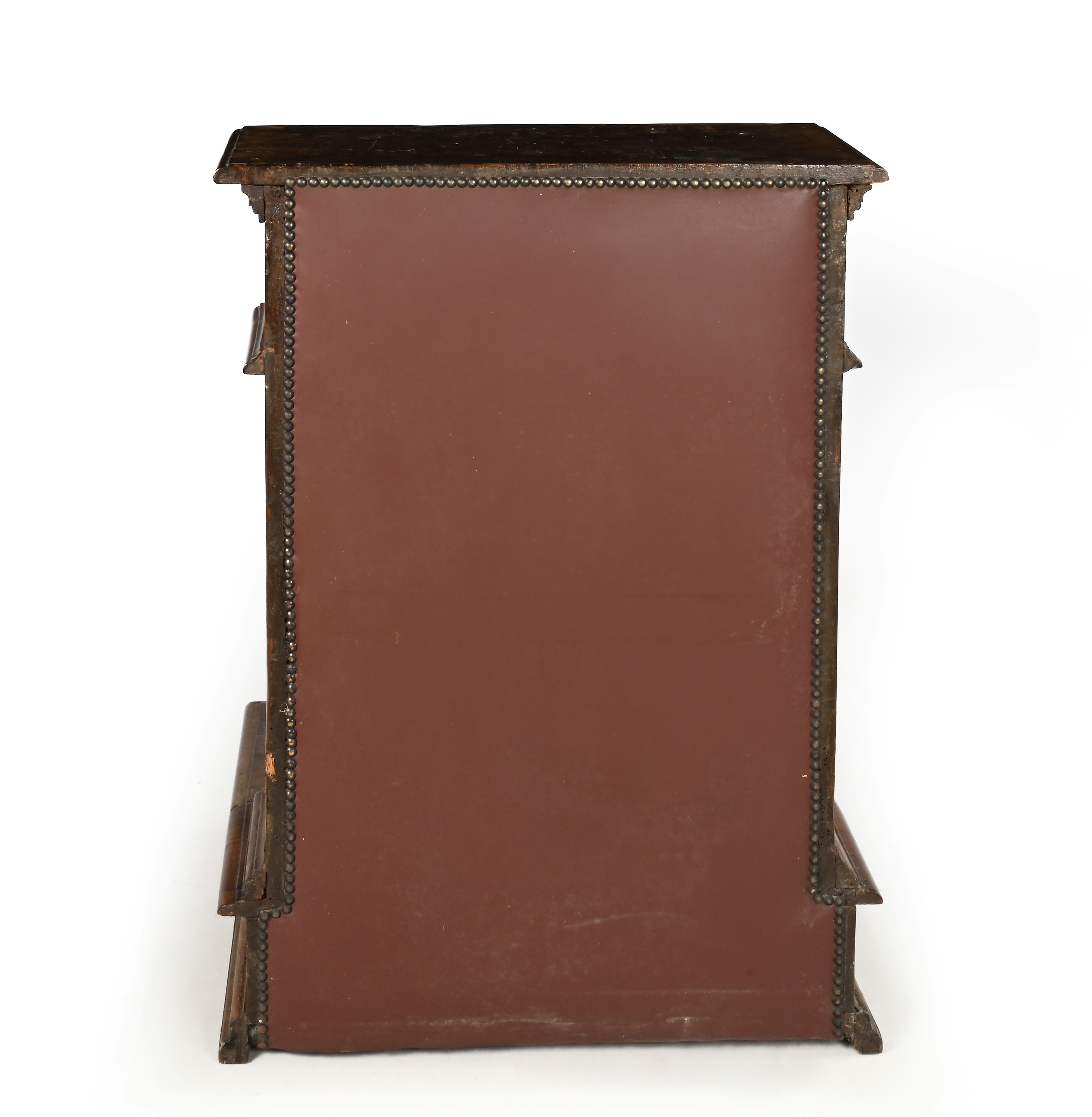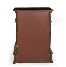 caratterizzato da uno stemma araldico intagliato in rilievo; un cassetto nella parte superiore, piano inferiore apribile, pannello posteriore rivestito in similpelle. Difetti e restauri