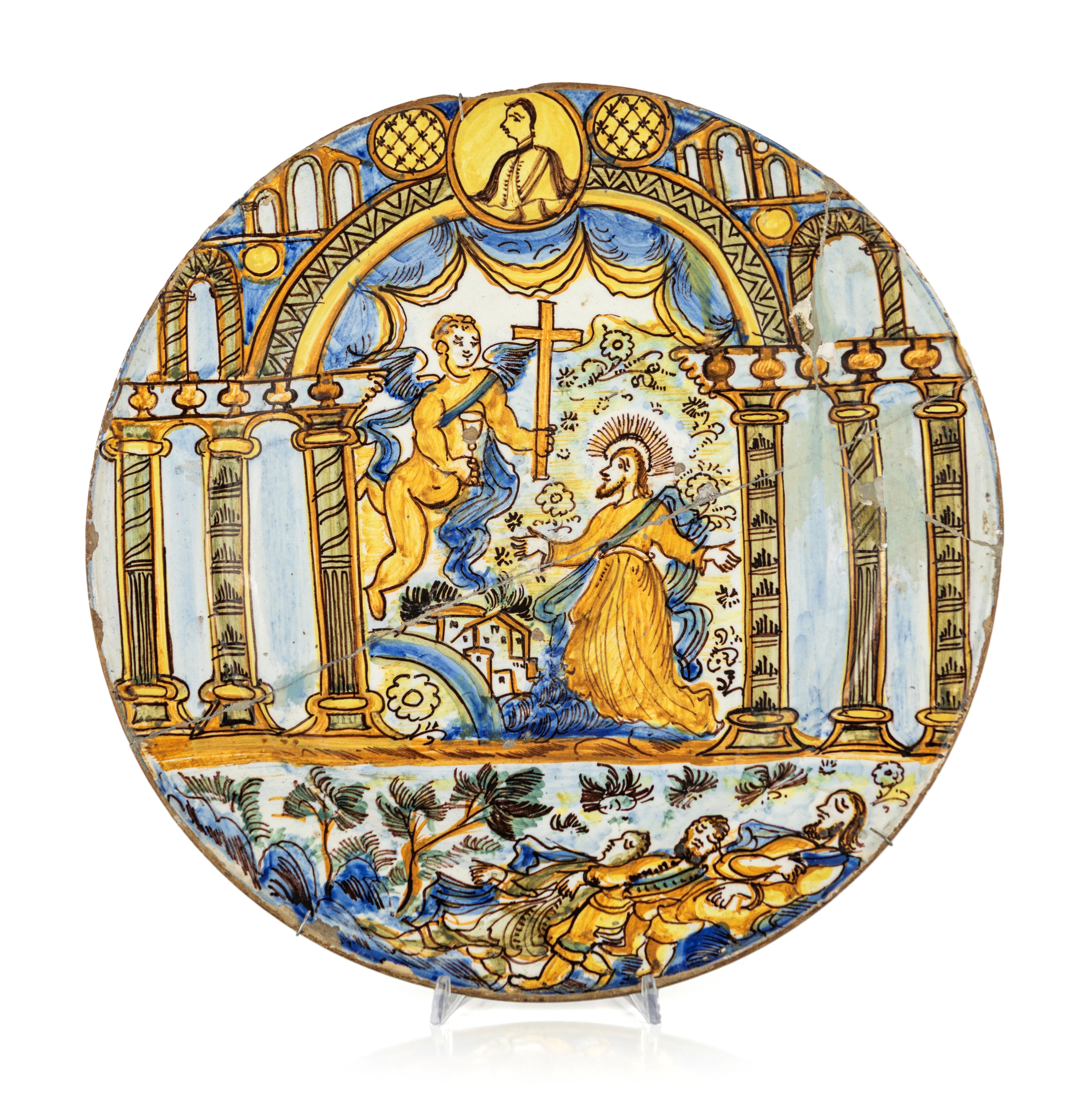 al centro, entro nicchia centinata delimitata da colonne, è raffigurato Cristo nell'orto di Getsemani; nella parte inferiore i discepoli addormentati. Marca assente. Lievi difetti e rotture (quattro frammenti rincollati)