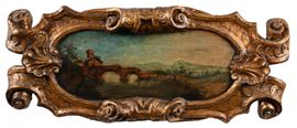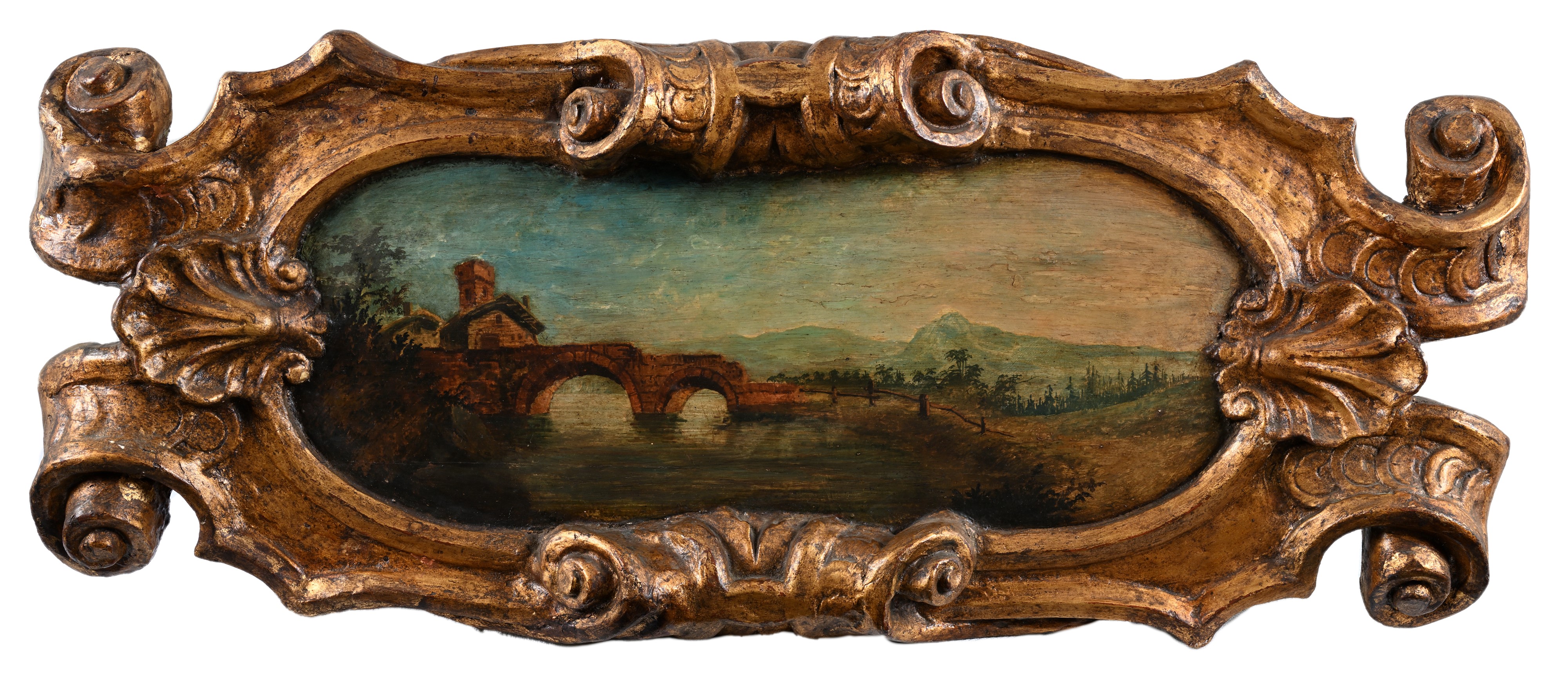 Sovrapporta con paesaggio fluviale, rovine e ponte