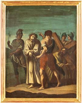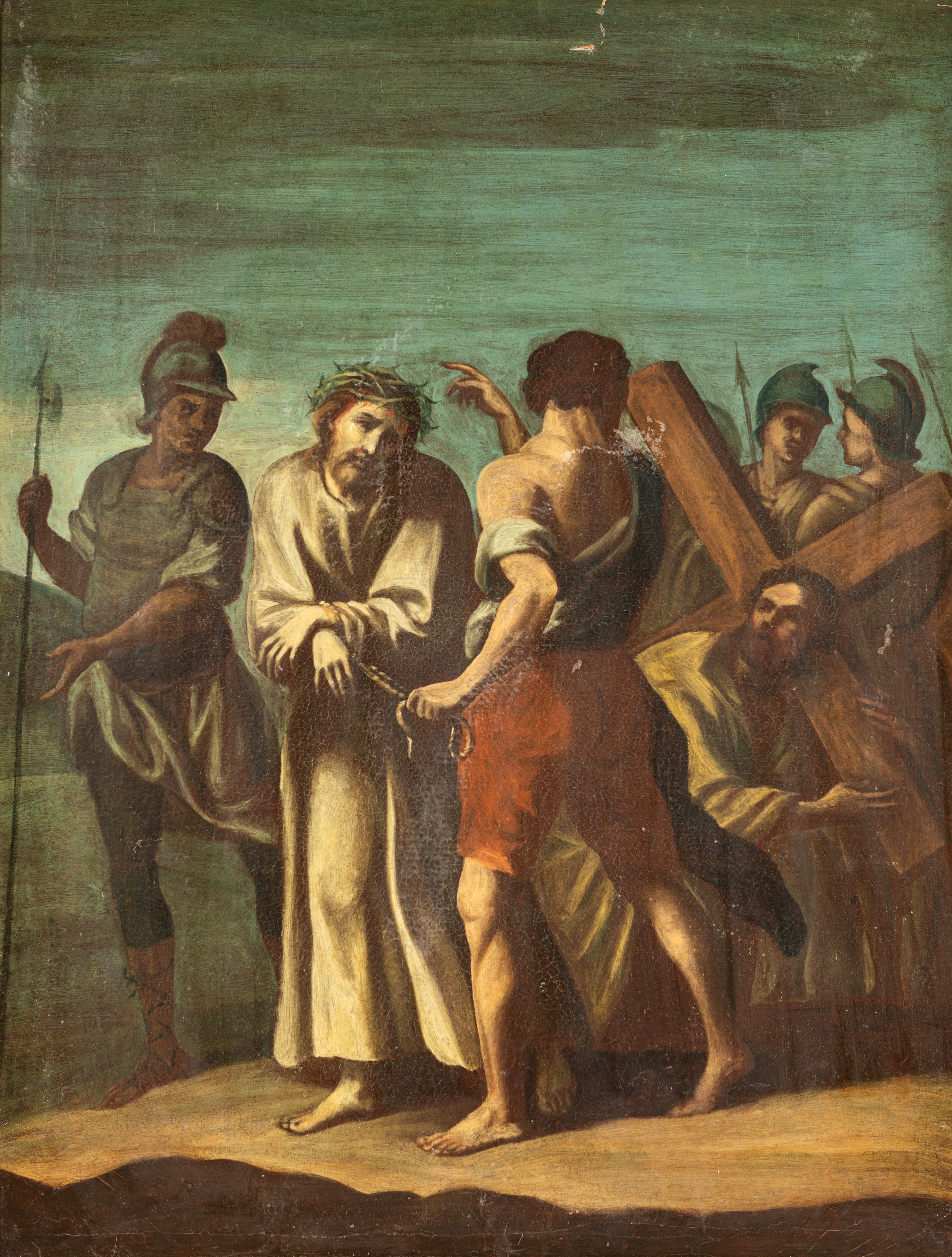 Simone di Cirene costretto dai soldati romani a portare la croce di Gesù verso il Golgota