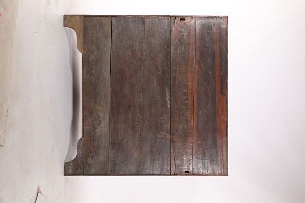 caratterizzato da fitte composizioni floreali poste ad ornare ogni partizione. Rullo apribile mediante ripiano estraibile; all'interno una piccola anta centrale affiancata da contenitori a forma di dorso di libro; ai lati uno scomparto e tre cassettini di linea sagomata. Corpo inferiore scandito da tre cassetti delimitati da spigoli curvilinei, grembiale sagomato, piedi sfuggenti