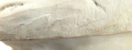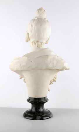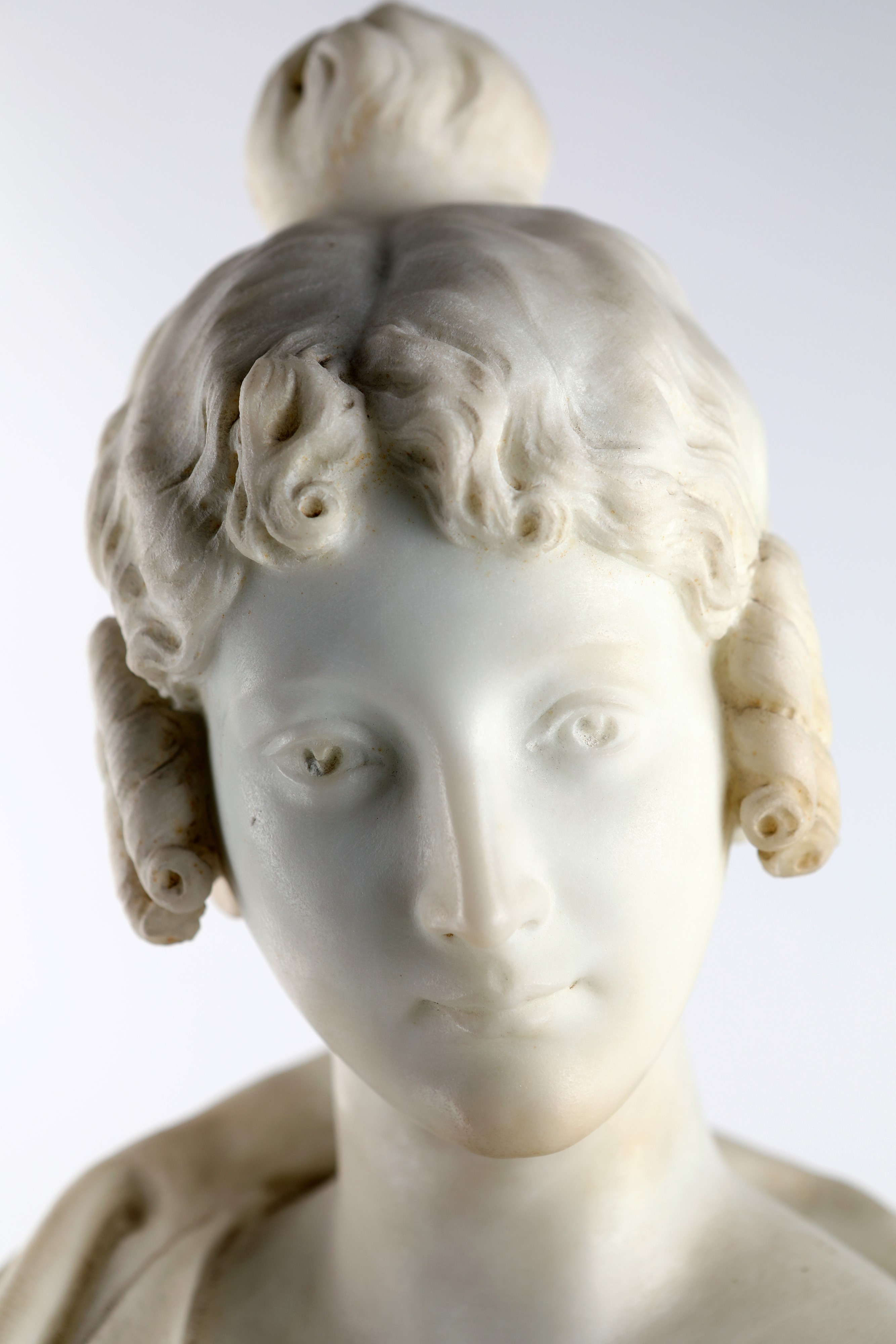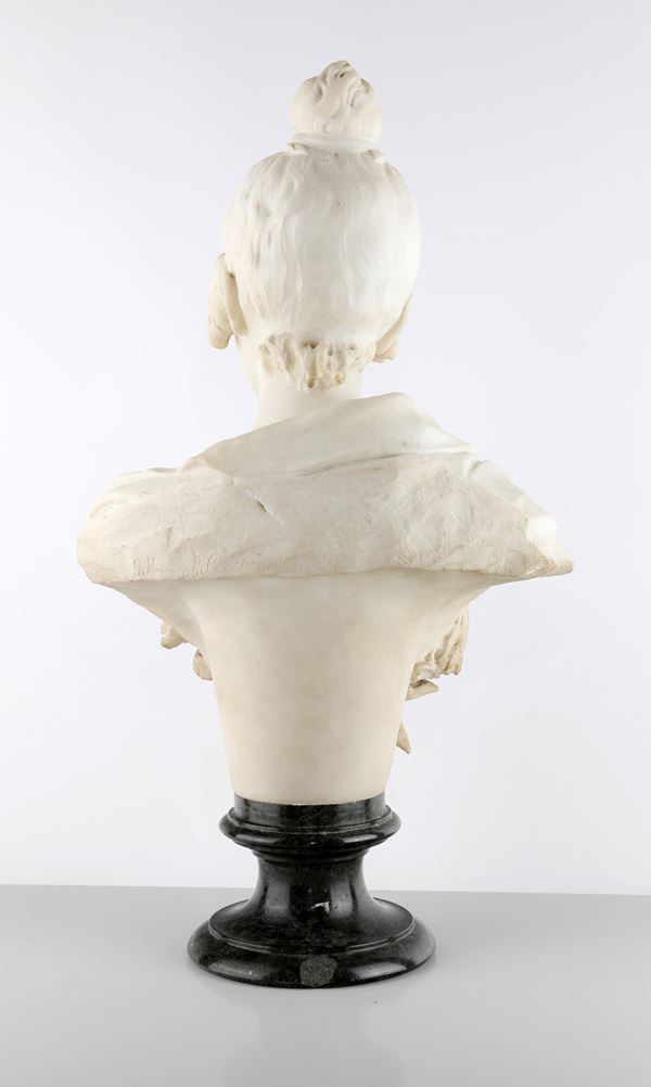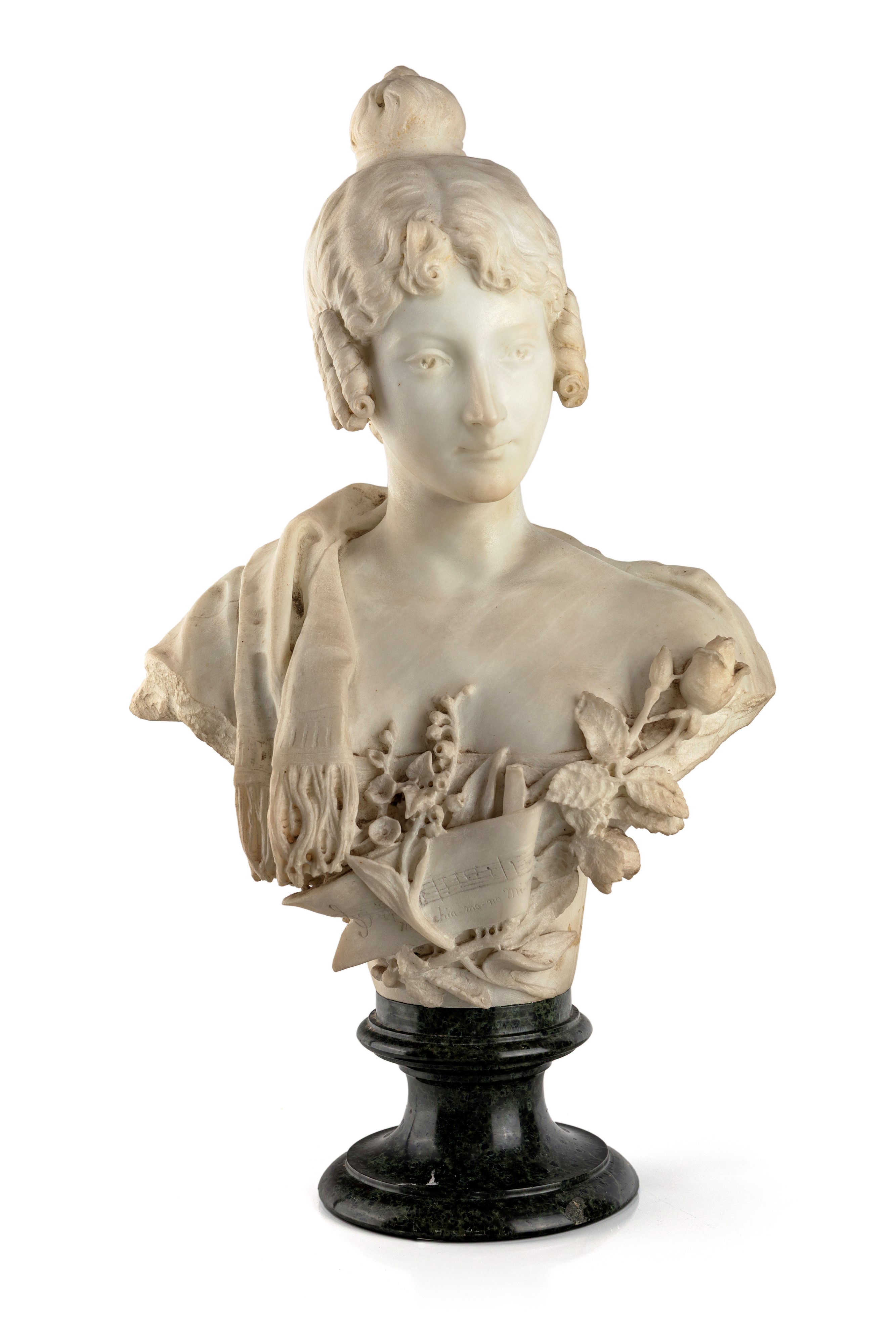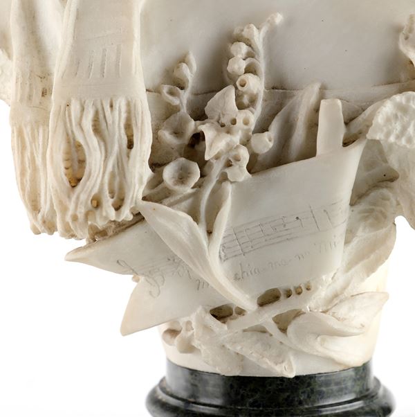 caratterizzata da rami recisi di rose e convolvoli a trattenere idealmente uno spartito musicale; piedistallo a rocchetto in marmo verde di Prato. Firmata e datata al verso, lungo il profilo dell'abito: G. Maranghi, Firenze 1910
