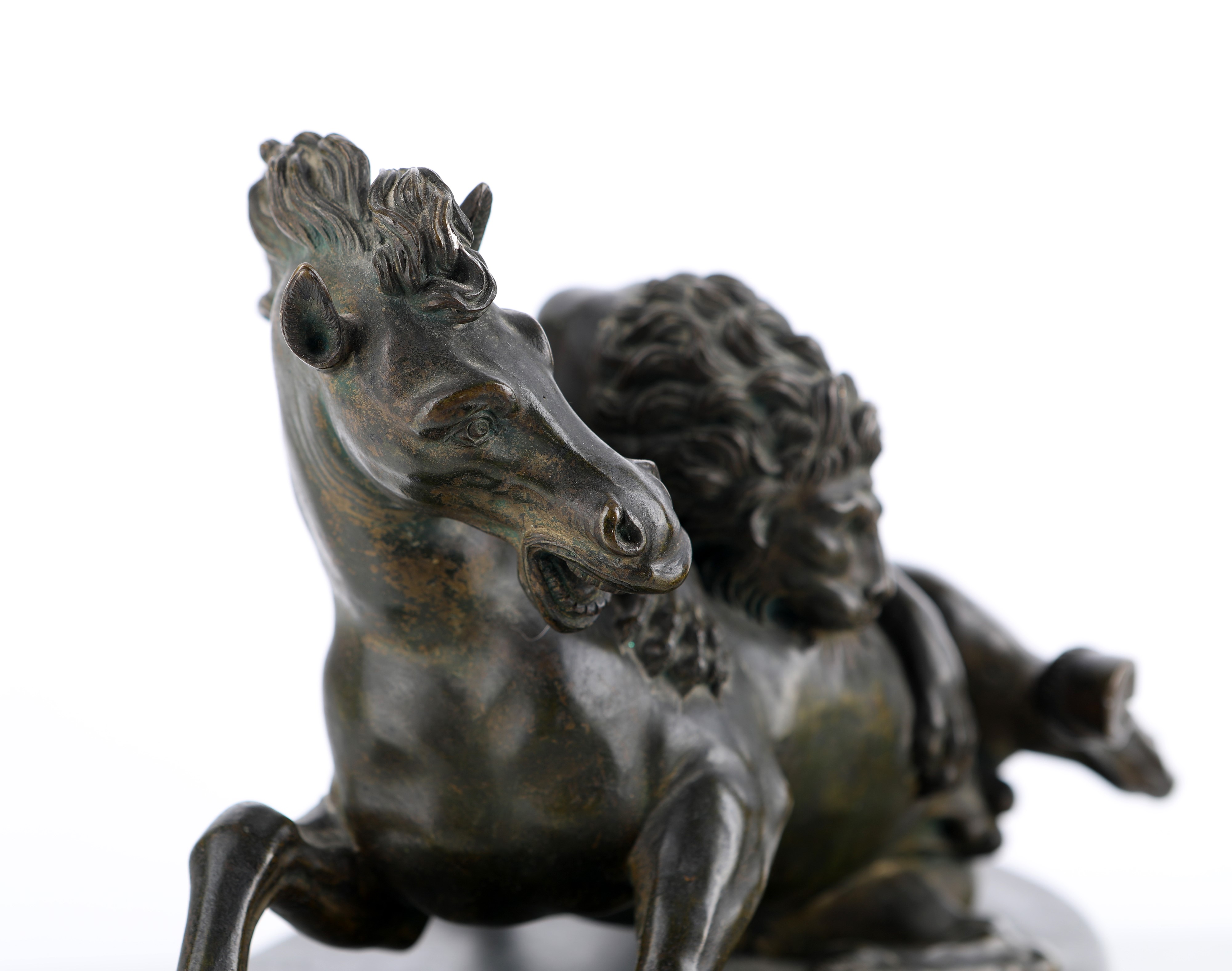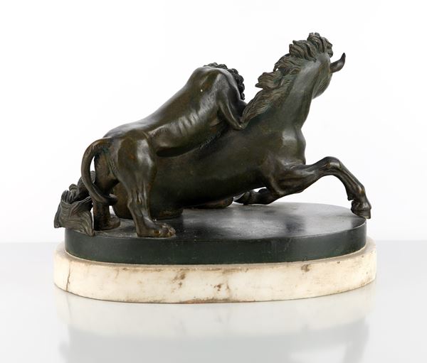 Scultura in bronzo raffigurante un leone che assale un cavallo, XIX secolo
