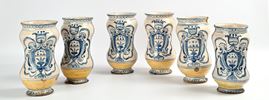 Sei albarelli in maiolica bianca con stemma, XVIII secolo