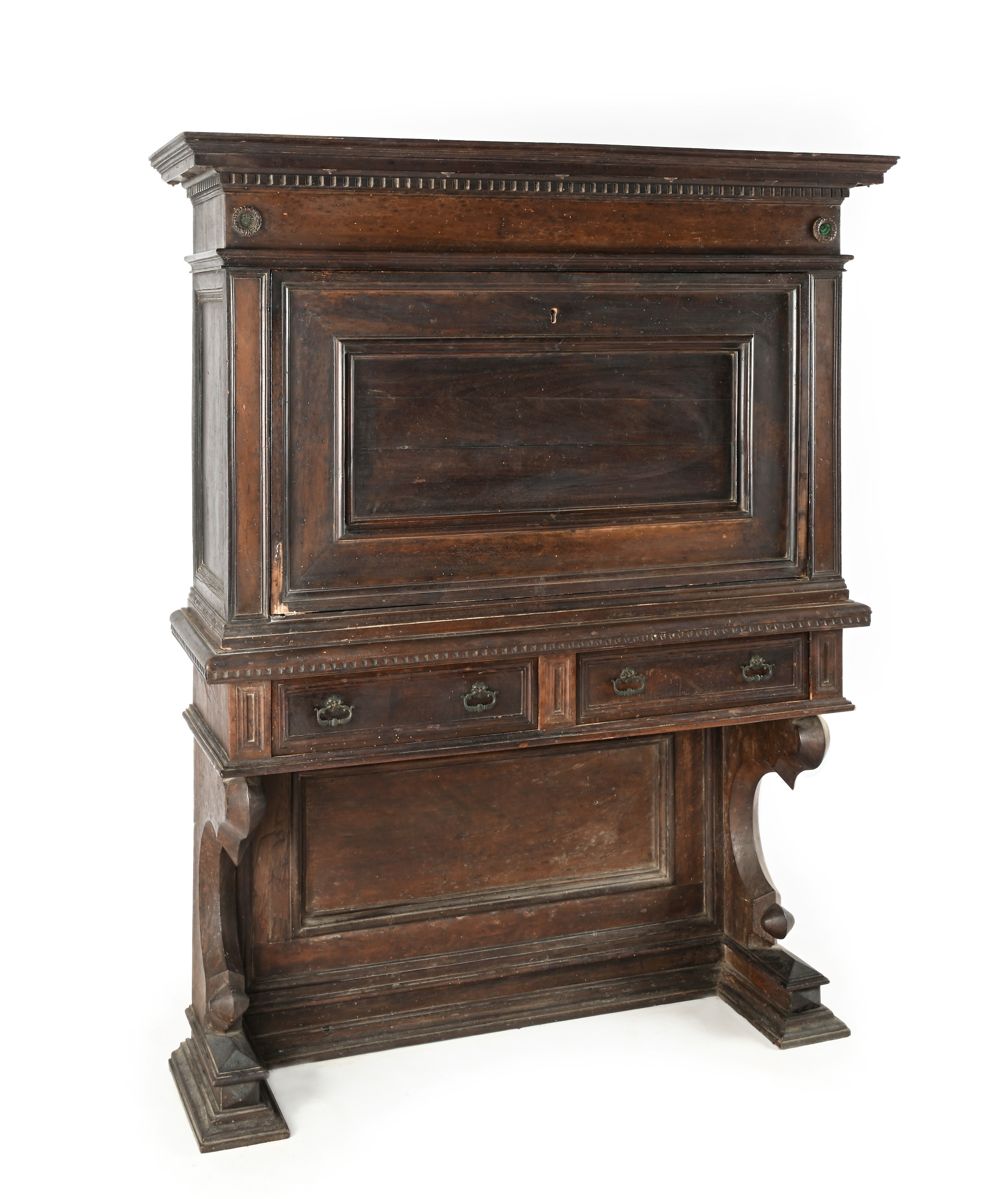 la ribalta cela una facciata di gusto architettonico impreziosita da placchette circolari in marmo e pietre dure, con nicchia centrale con portina affiancata da due ante centinate delimitate da lesene a colonna e due cassetti allineati compresi nella cornice sottostante. Ogni anta centinata ospita un vano e cinque tiretti in colonna.