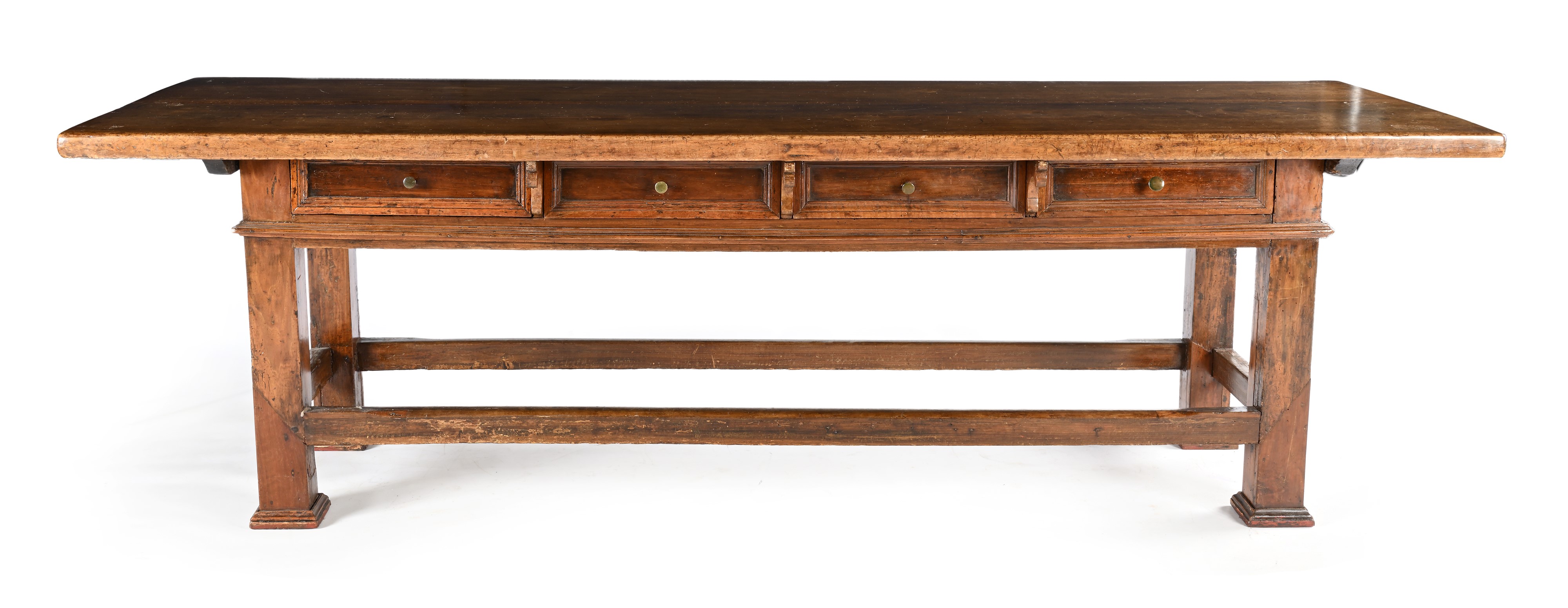 piano sporgente, quattro cassetti in linea nella fascia, gambe squadrate riunite da traverse