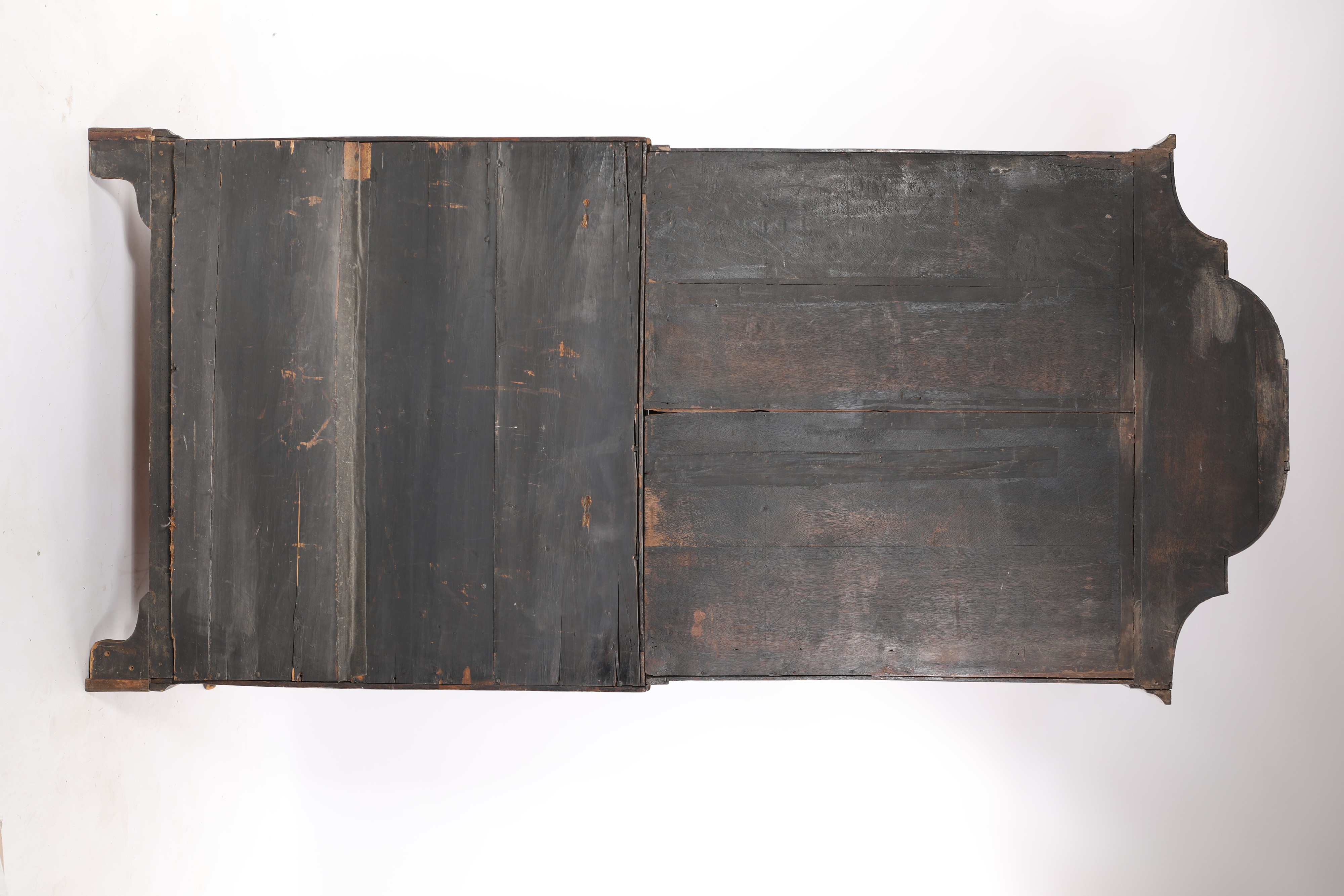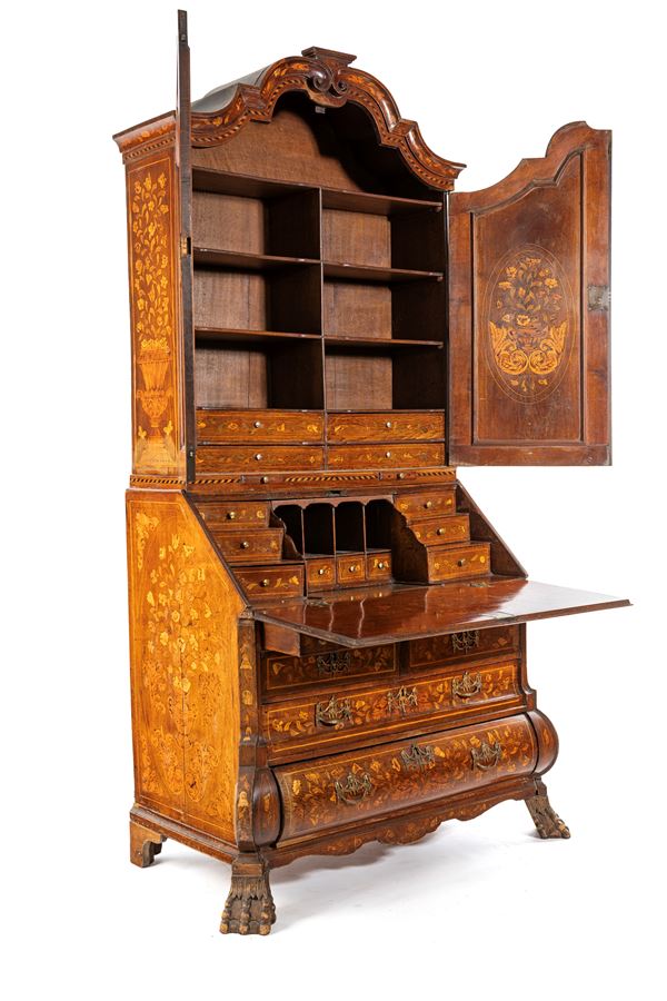 corpo superiore a due sportelli con tablettes portacandela estraibili sottostanti, che celano sette scomparti di diversa misura e quattro cassetti; corpo inferiore con due tiretti disposti ai lati della fascia, due cassetti allineati e due in colonna sottostanti caratterizzati da fascia concava e convessa. La ribalta ospita quattro vani allineati e quattro tiretti sottostanti disposti al centro, affiancati da tre cassetti a scalare disposti ai lati e la porzione centrale del piano scorrevole con ampio vano segreto. Grembiale sagomato, piedi ferini