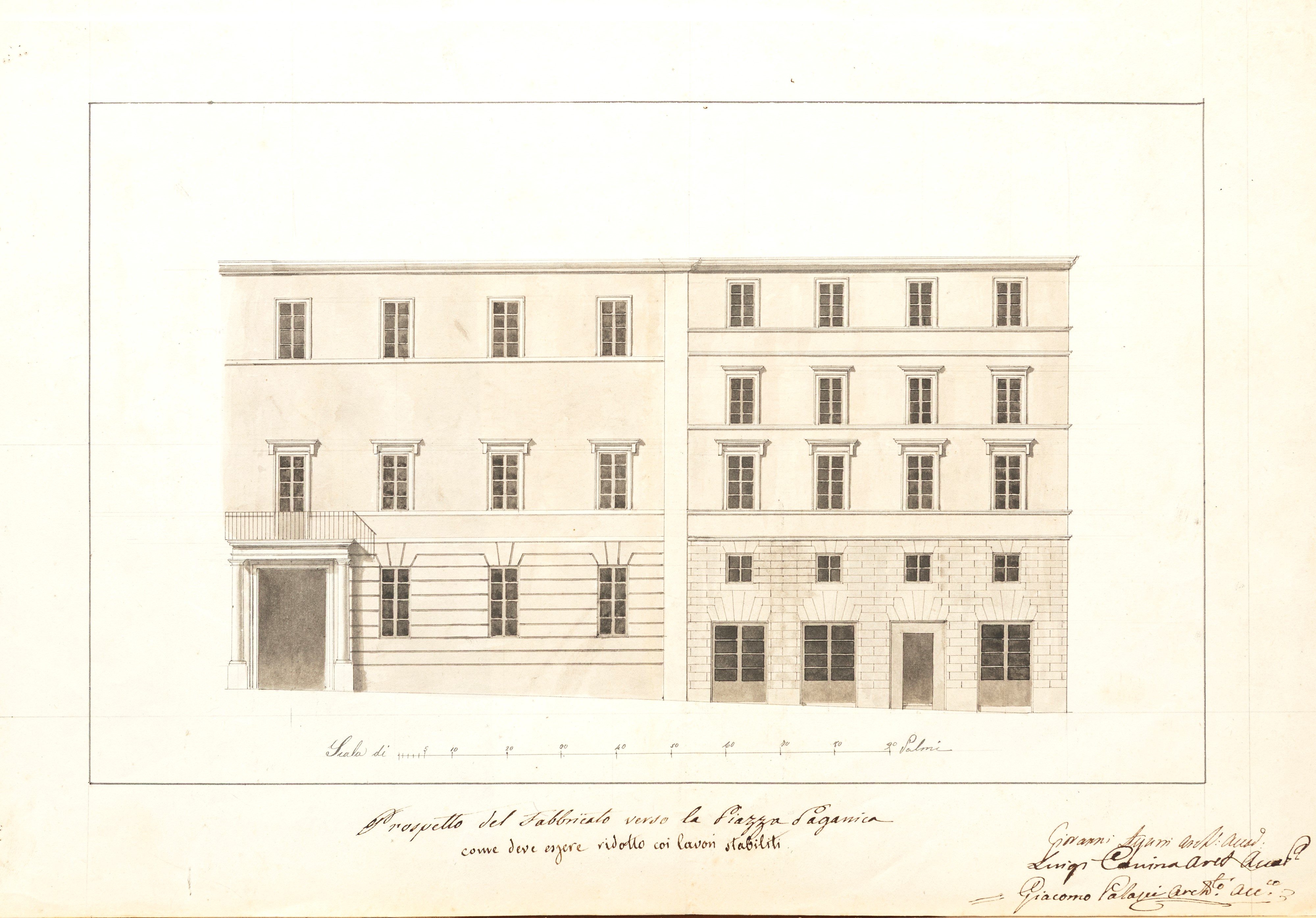 Iscritto in basso al centro "Prospetto del Fabbricato verso la Piazza Paganica come deve essere ridotto coi lavori stabiliti"