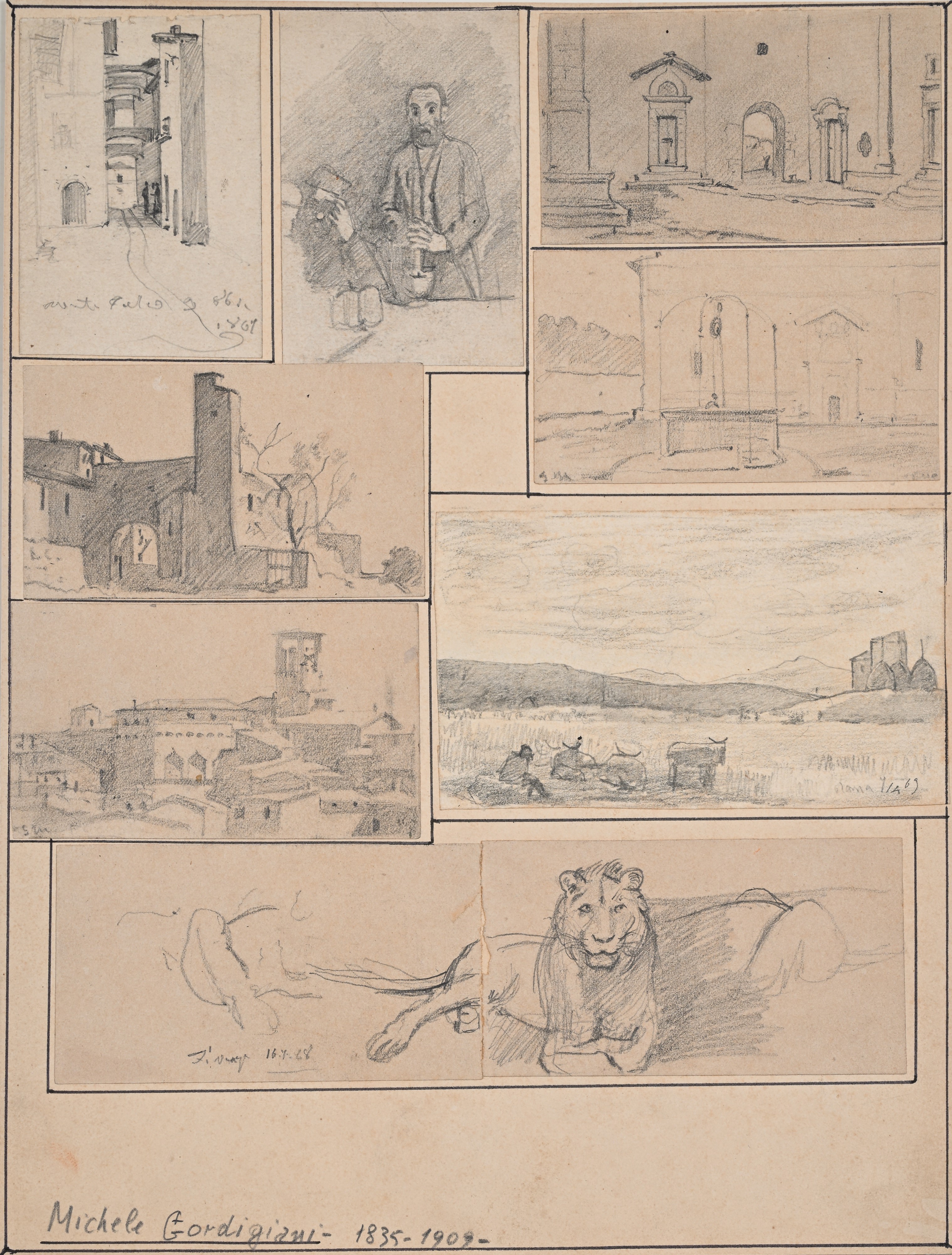 Sul grande passe-partout sono incollati una serie di disegni tratti dal vero