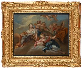 Si tratta con ogni probabilità dello studio preparatorio per l’importante commissione che François Le Moyne realizzò durante il regno di Luigi XV, tra il 1731 e il 1736, per uno dei soffitti del Grand Appartement du Roi nella Reggia di Versailles.