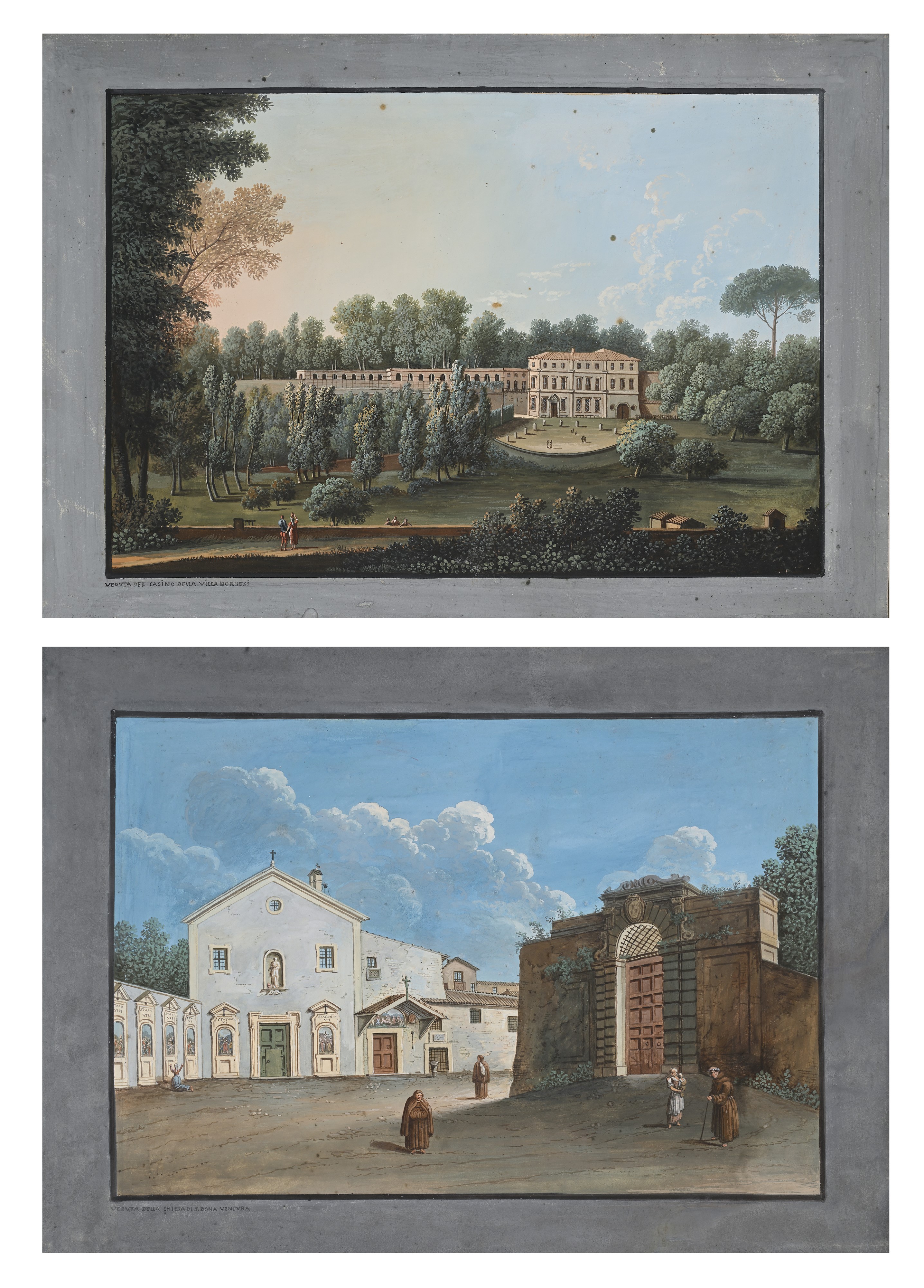 Veduta della chiesa di San Bonaventura; Veduta del Casino di Villa Borghese