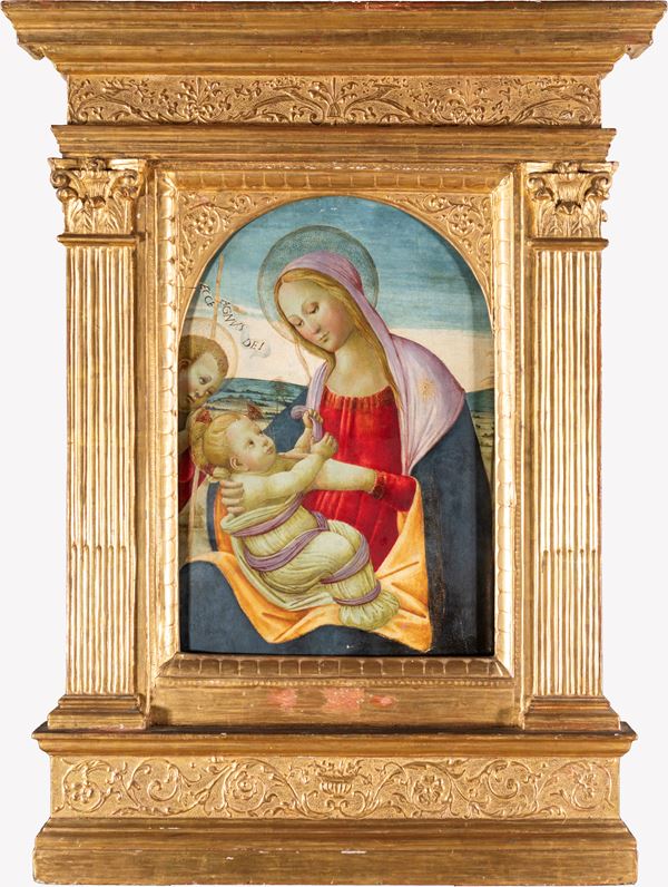 La Vergine, avvolta in un manto blu e un velo rosato, tiene in grembo il Bambino Gesù che, fasciato, afferra con gesto affettuoso il velo materno. Alle sue spalle compare il piccolo san Giovanni Battista, riconoscibile dal cartiglio ECCE AGNUS DEI. Sullo sfondo, un paesaggio sereno di colline e alberi contribuisce all’atmosfera raccolta, tipica della pittura devozionale privata.