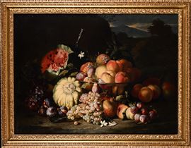 La tela raffigura “un bacile in vetro con pesche, susine e fiori di gelsomino posto all’aperto sul limitare di un costone roccioso visto in controluce, ai cui piedi sono poggiati grappoli d’uva bianca e nera, fichi, zucca, anguria, melagrane, altre pesche e susine. Sullo sfondo, una montagna la cui sommità è coperta da una nuvola che a mio parere potrebbe alludere al Vesuvio in eruzione”. “Si tratta infatti di una variante autografa e di qualità notevole del dipinto che ho pubblicato nella mia monografia su Abraham Brueghel (n. 99, p. 146)… la differenza fondamentale è la presenza in secondo piano di un’anguria spaccata al posto del vaso metallico colmo di fiori”. “Il quadro qui studiato si deve considerare una importante riscoperta, in quanto era conosciuto solo da una vecchia fotografia in bianco e nero (asta Sotheby’s, 1981)…”. “I frutti sono descritti con grande acribia naturalistica, tipica del pittore fiammingo che – nonostante la piena adesione alla cultura barocca italiana – non rinuncerà mai del tutto all’approccio descrittivo e ‘ottico’ alla natura proprio della sua cultura d’origine”. “Si tratta di un’opera di altissimo livello qualitativo, da datarsi nel periodo napoletano del pittore… sappiamo che vi fu un’impressionante eruzione del Vesuvio nel 1682 ed è possibile che il pittore possa alludere a quell’evento”. “In un quadro come quello qui studiato si notano bene quella scioltezza e freschezza di colore di cui parla appropriatamente il biografo napoletano settecentesco Bernardo De Dominici a proposito delle opere napoletane di Brueghel”. “Proprio in quadri come quello qui analizzato si può legittimamente scorgere la pregevole, inimitabile sintesi tra naturalismo fiammingo e gusto barocco italiano che porterà Abraham Brueghel ad essere uno dei grandi protagonisti europei del genere della natura morta nella seconda metà del Seicento.”